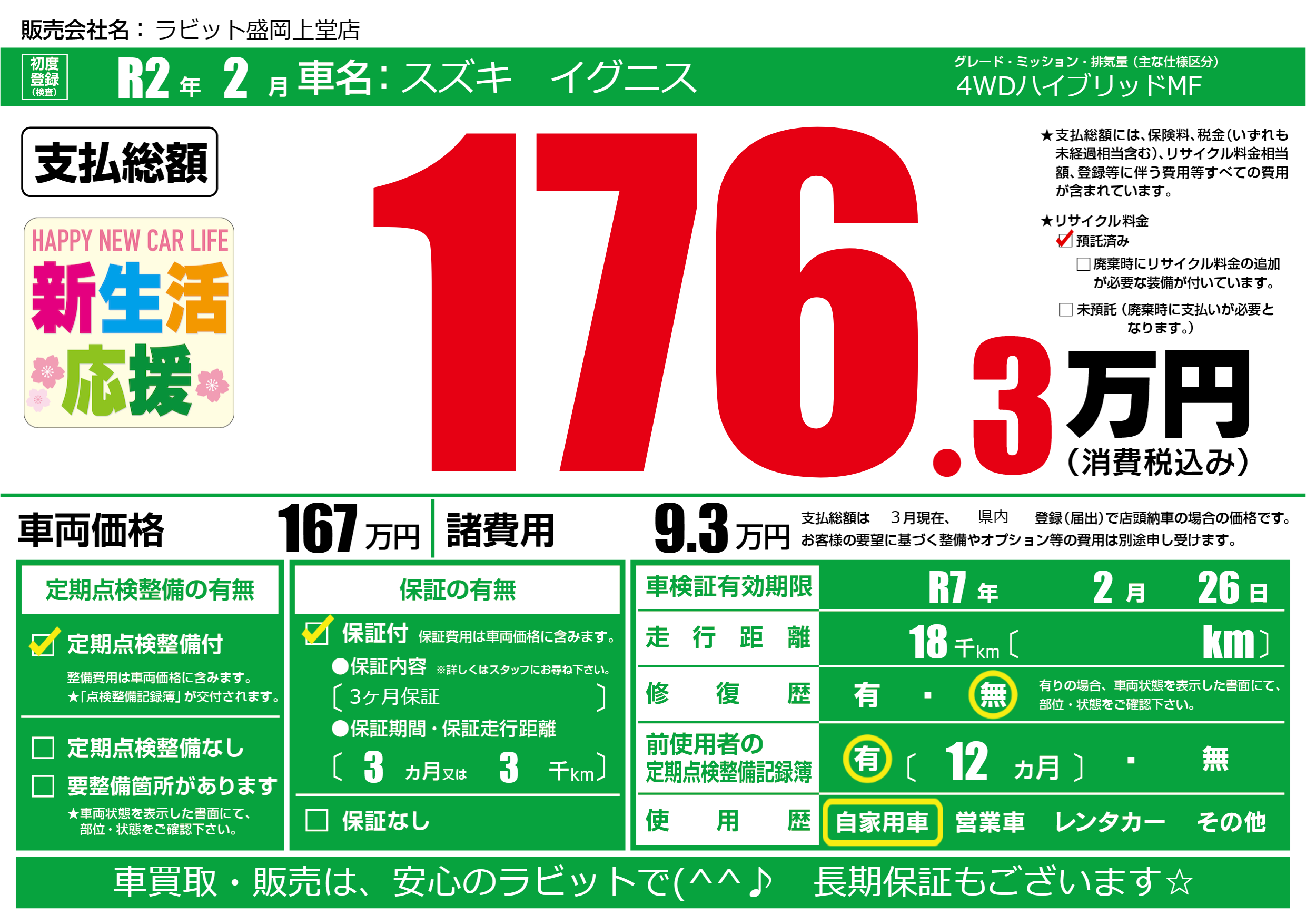 | 走行キロ | 1.8万km | 初年度登録 | R2年2月 |