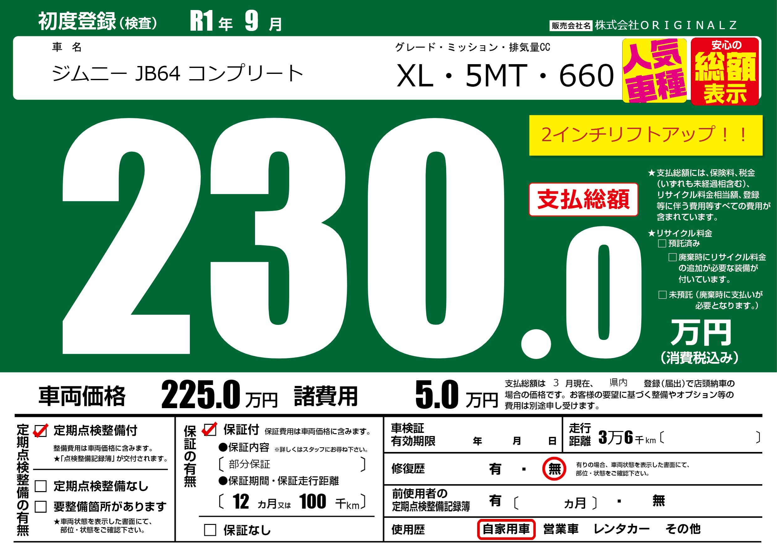 | 車名 | ジムニー JB64 コンプリート | グレード ミッション 排気量 |