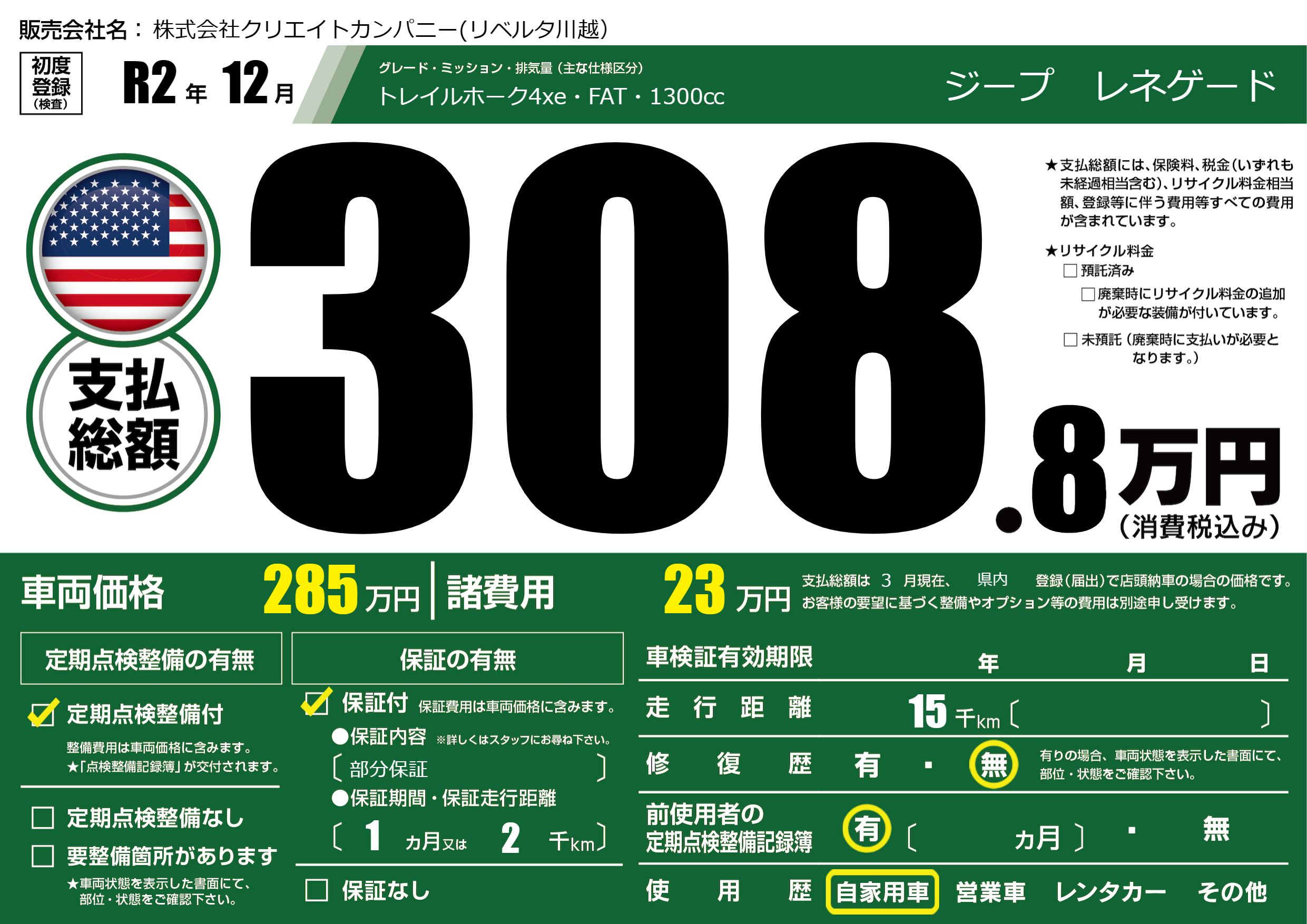 | 車名 | ジープ レネゲード | グレード ミッション 排気量 |
