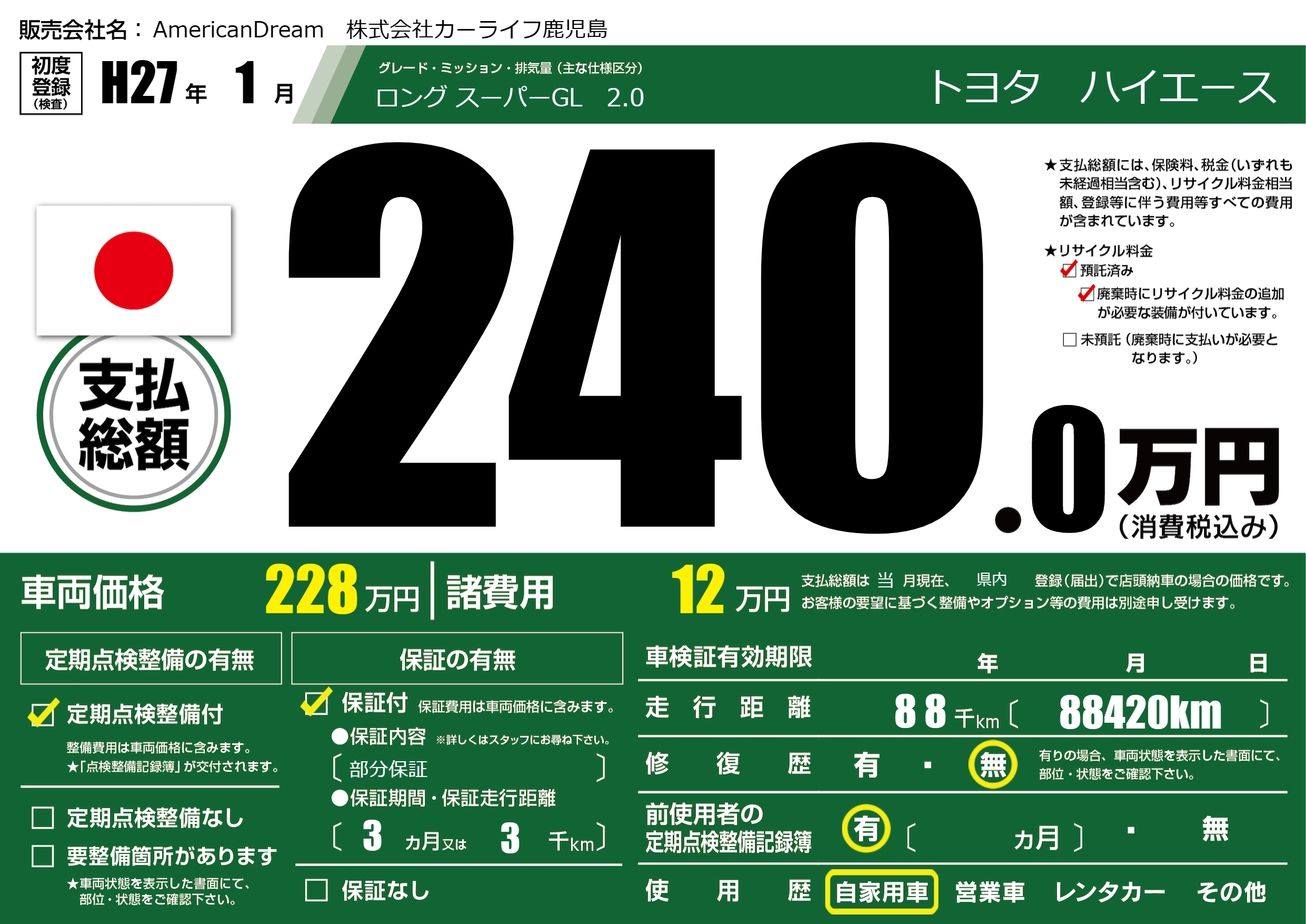 | 車名 | トヨタ ハイエース | グレード ミッション 排気量 |