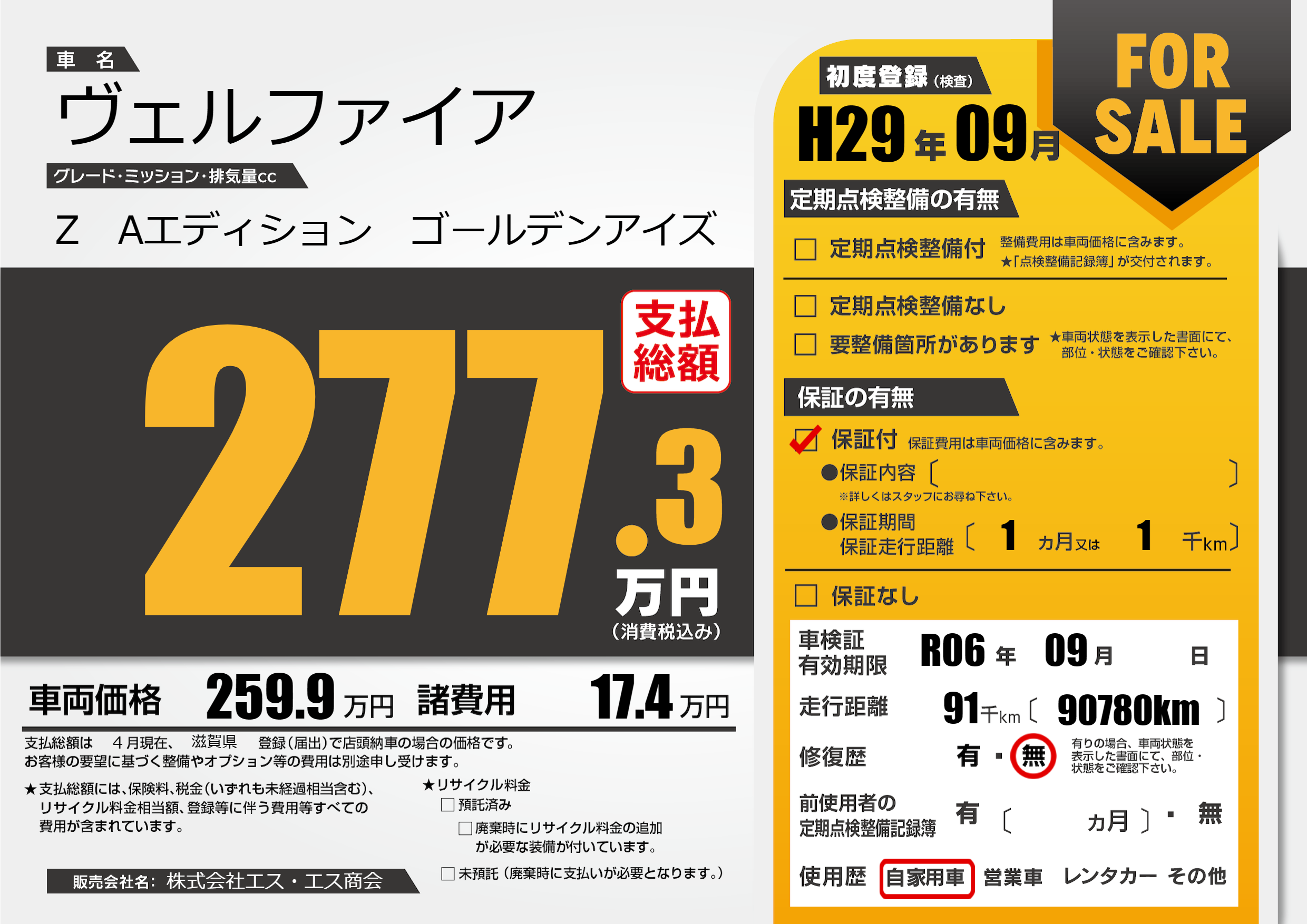 | 車名 | ヴェルファイア | グレード ミッション 排気量 |
