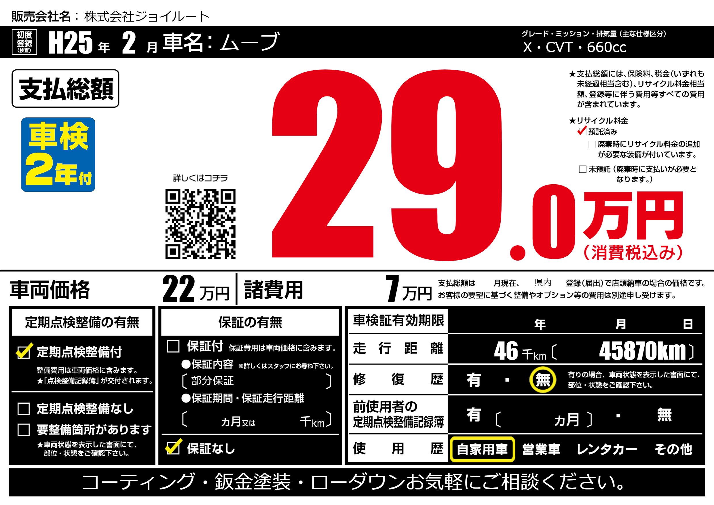 | 走行キロ | 4.6万km | 初年度登録 | H25年2月 |