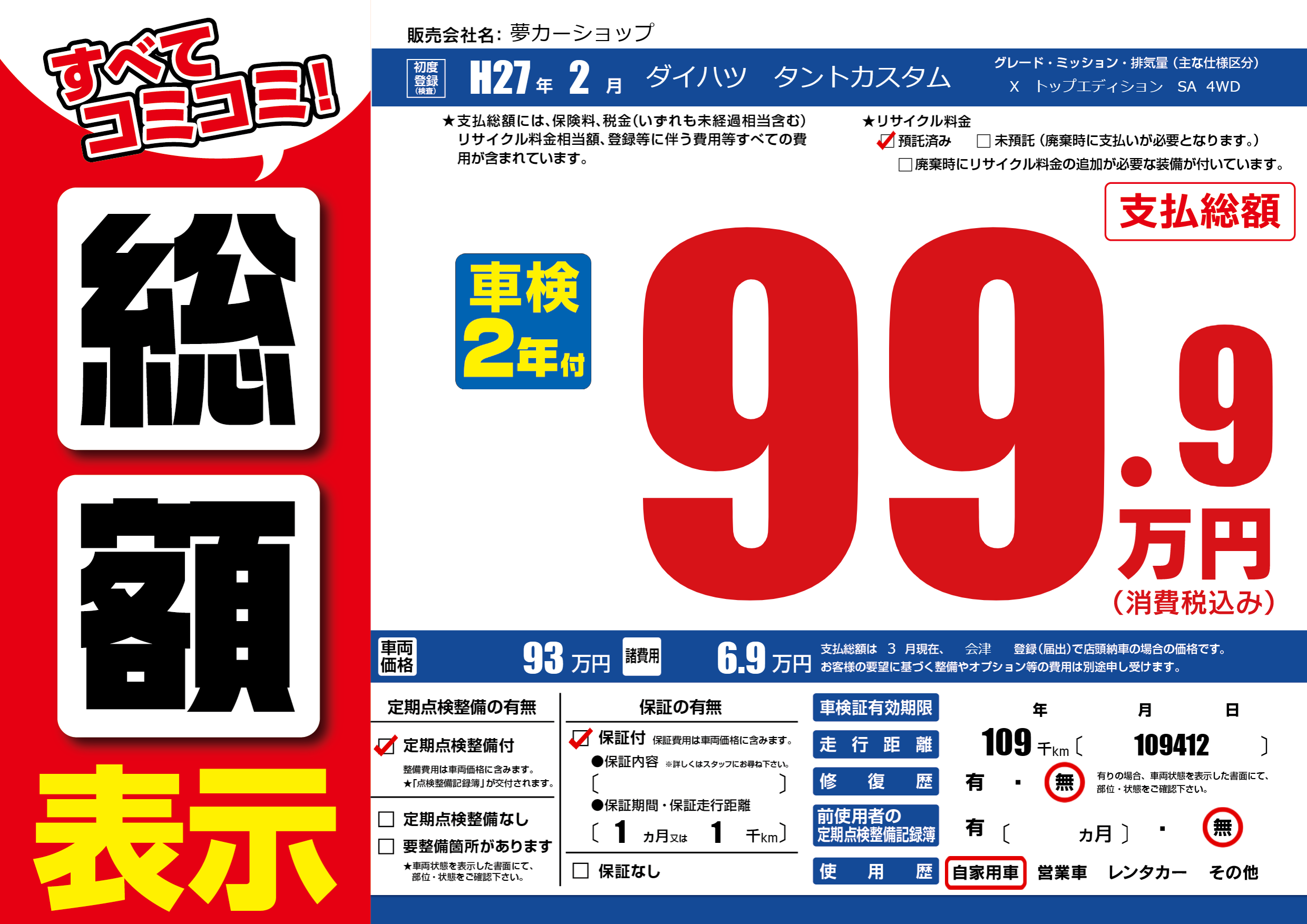 | 走行キロ | 10.9万km | 初年度登録 | H27年2月 |