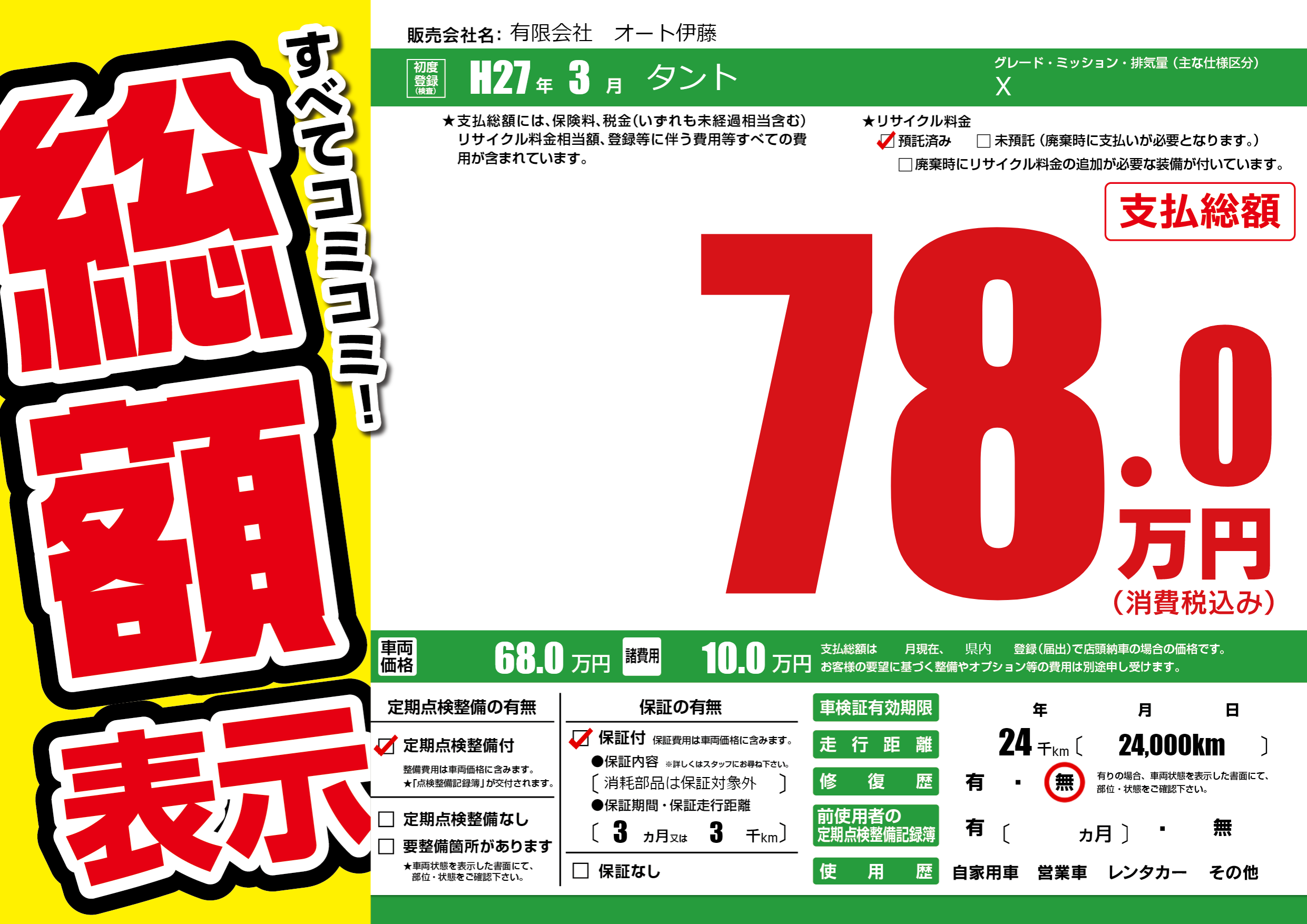 | 車名 | タント | グレード ミッション 排気量 |