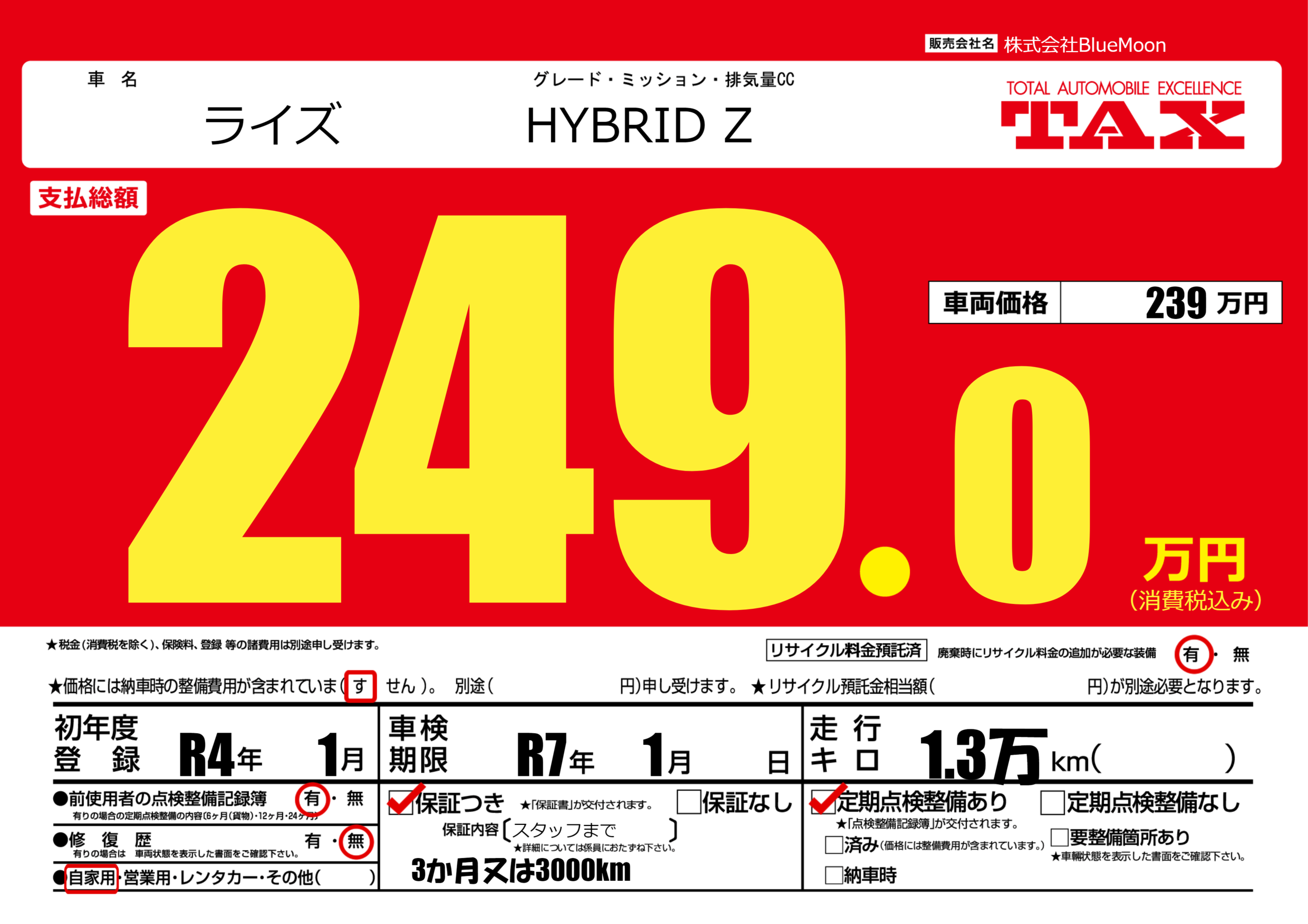 | 車名 | ライズ | グレード ミッション 排気量 |