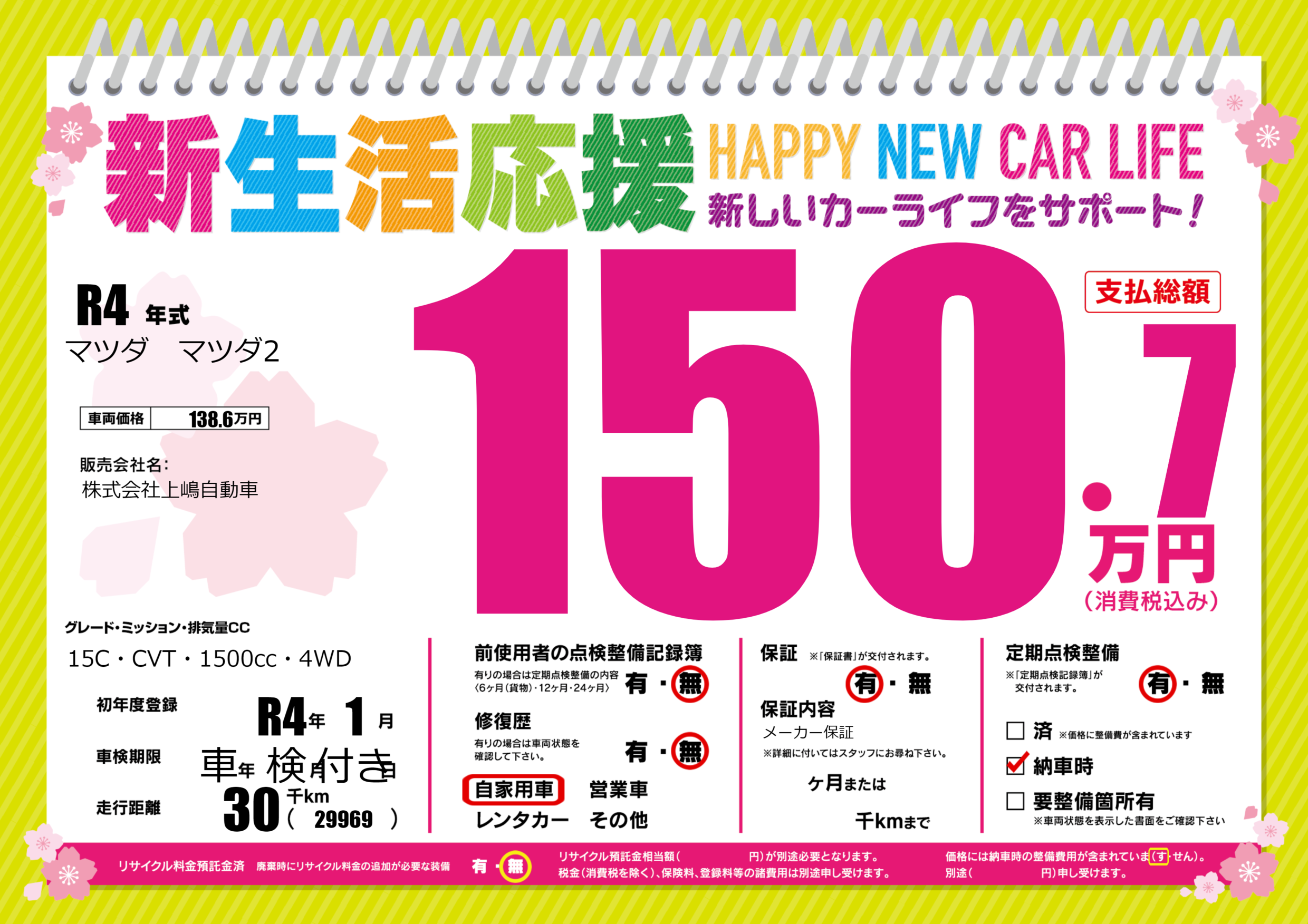 | 定期点検整備 | 定期点検整備あり 納車時あり | ||