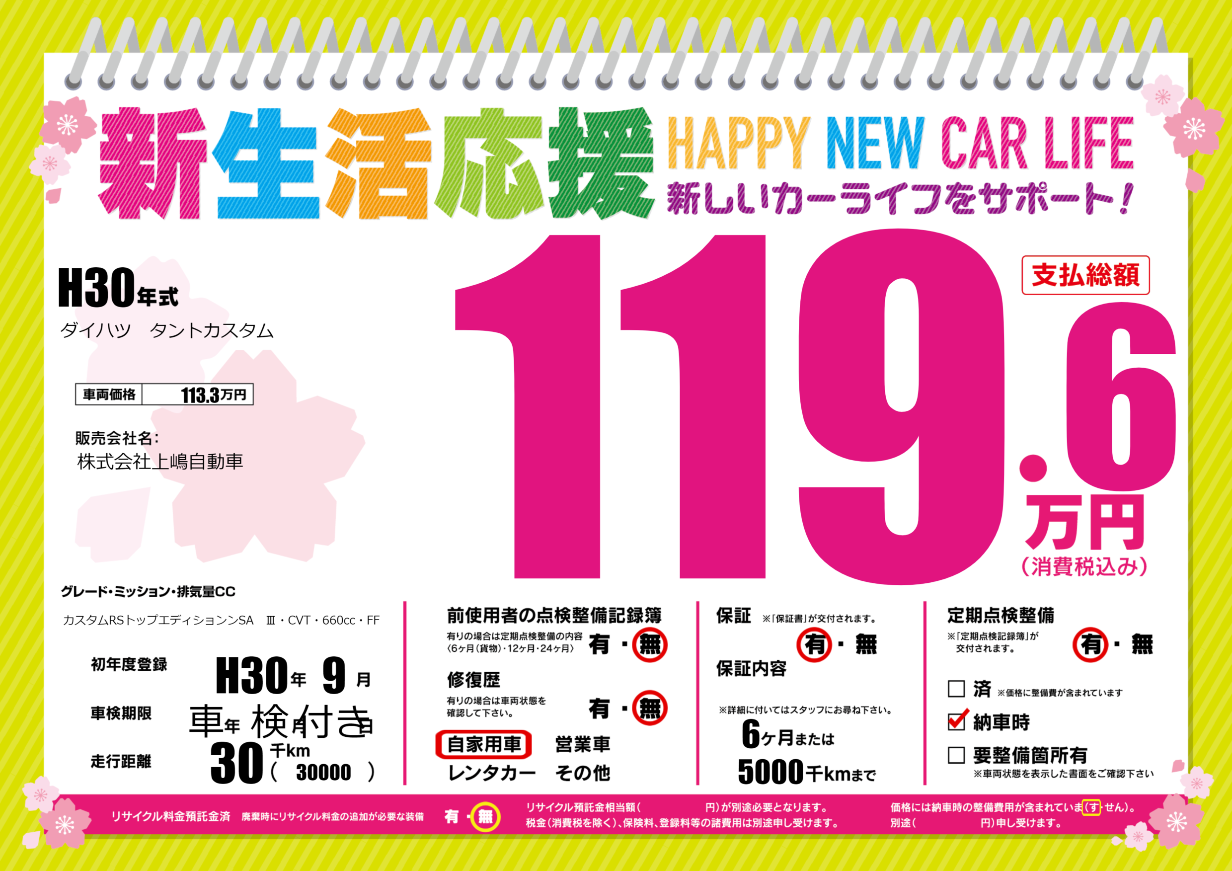 | 走行キロ | 3万km | 初年度登録 | H30年9月 |