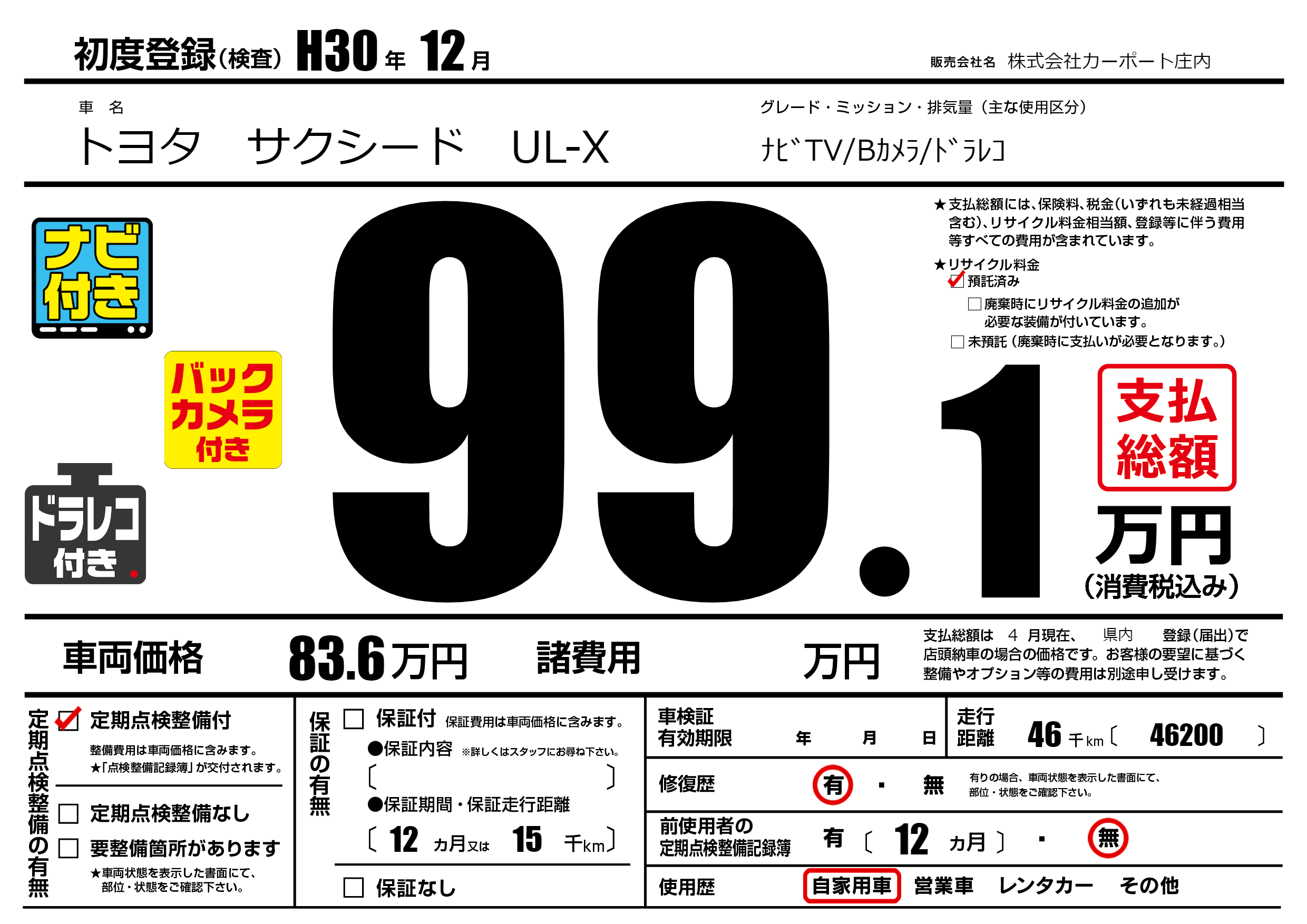 | 初年度登録 | H30年12月 | ||