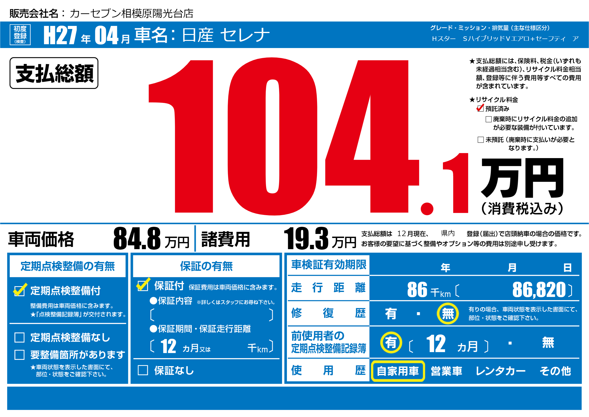 | 車名 | 日産 セレナ | グレード ミッション 排気量 |