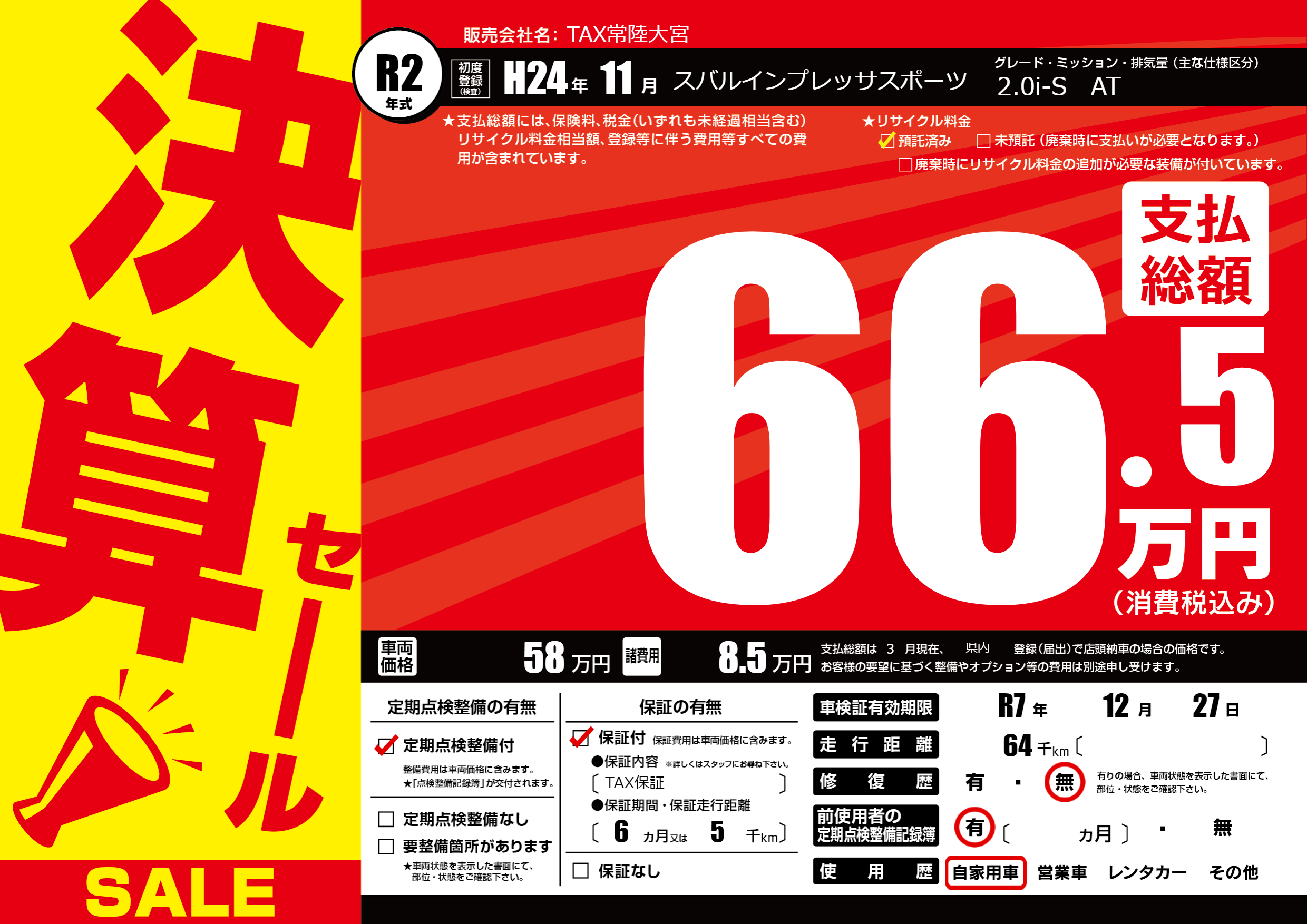保証付き 保証内容(TAX保証) 6ヶ月または(5)千kmまで |