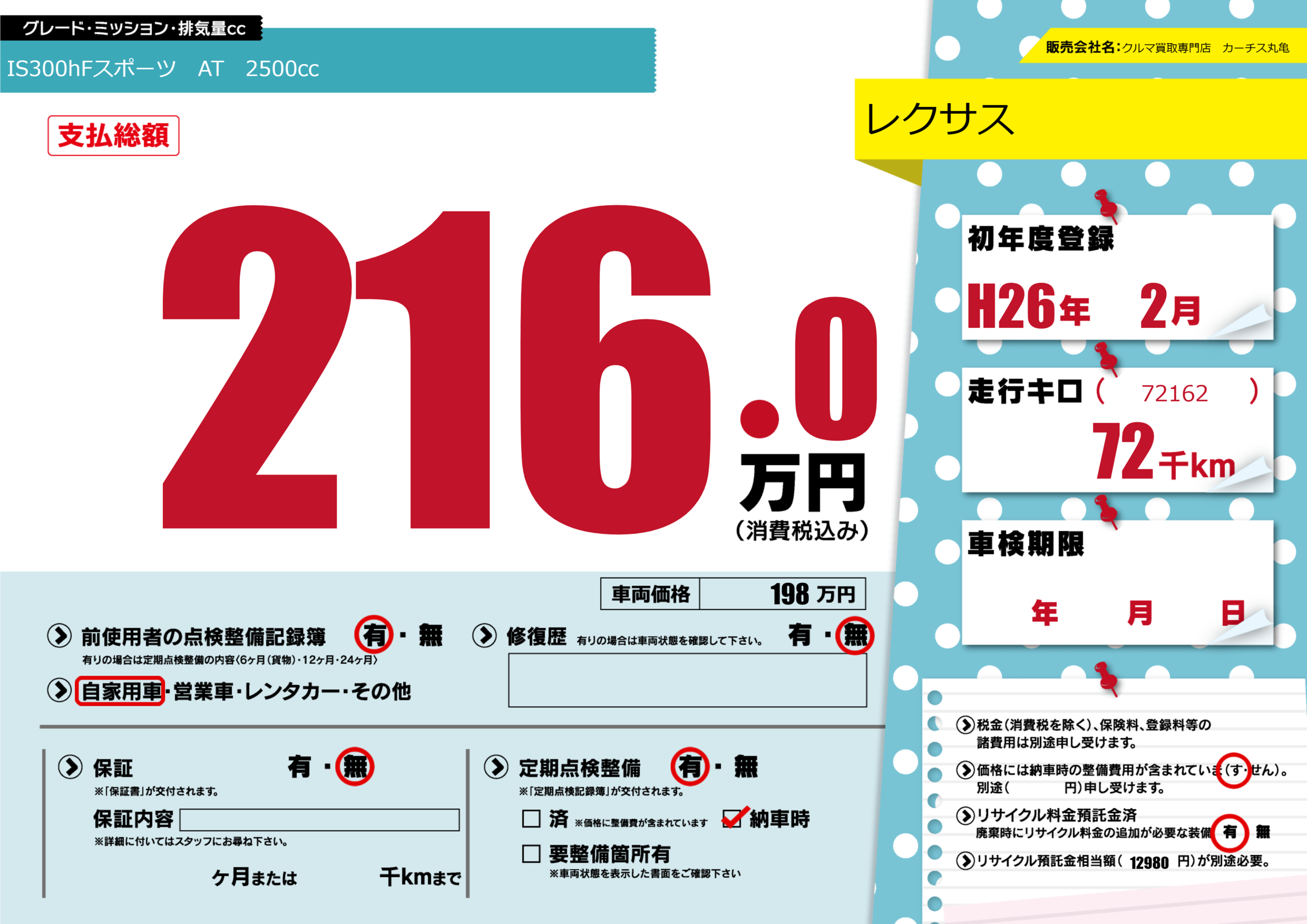 あり | リサイクル預託金相当額 | ( 12980円)が別途必要 |