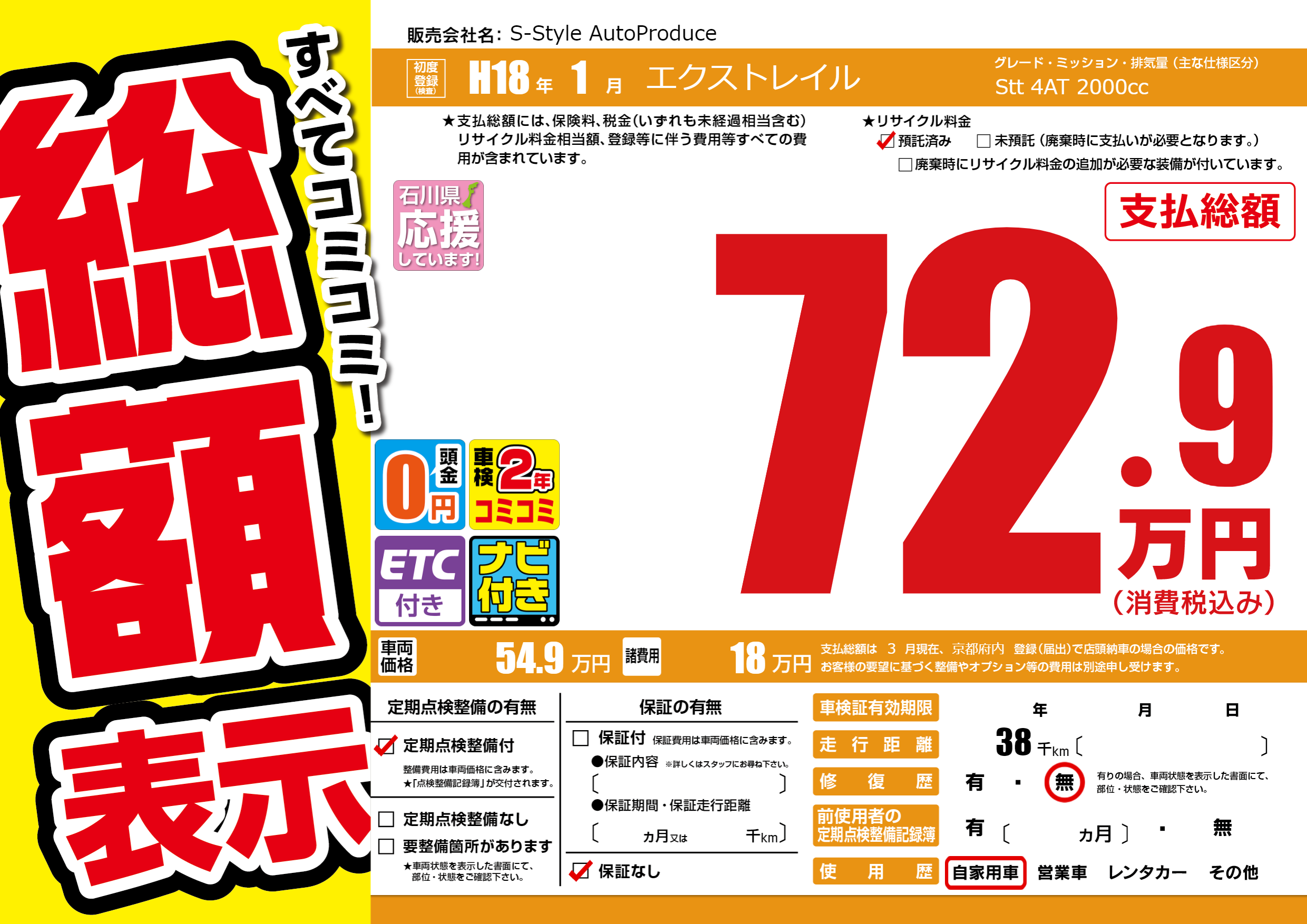 | 走行キロ | 3.8万km | 初年度登録 | H18年1月 |