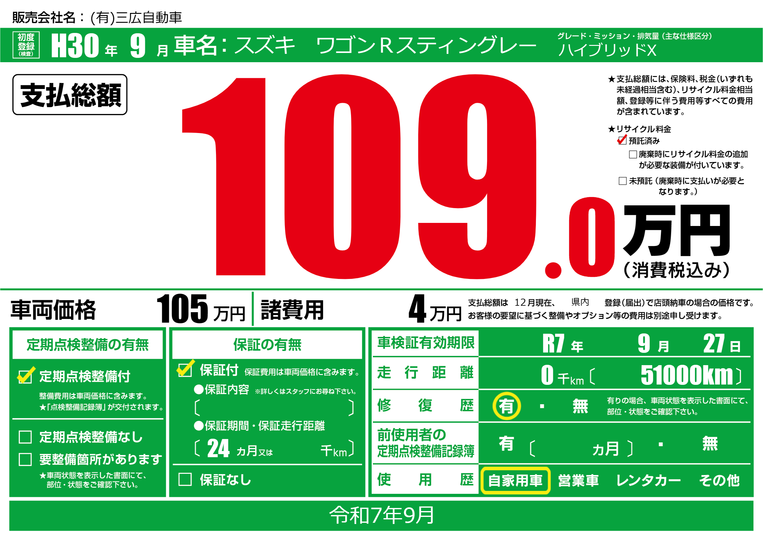 | 走行キロ | - | 初年度登録 | H30年9月 |