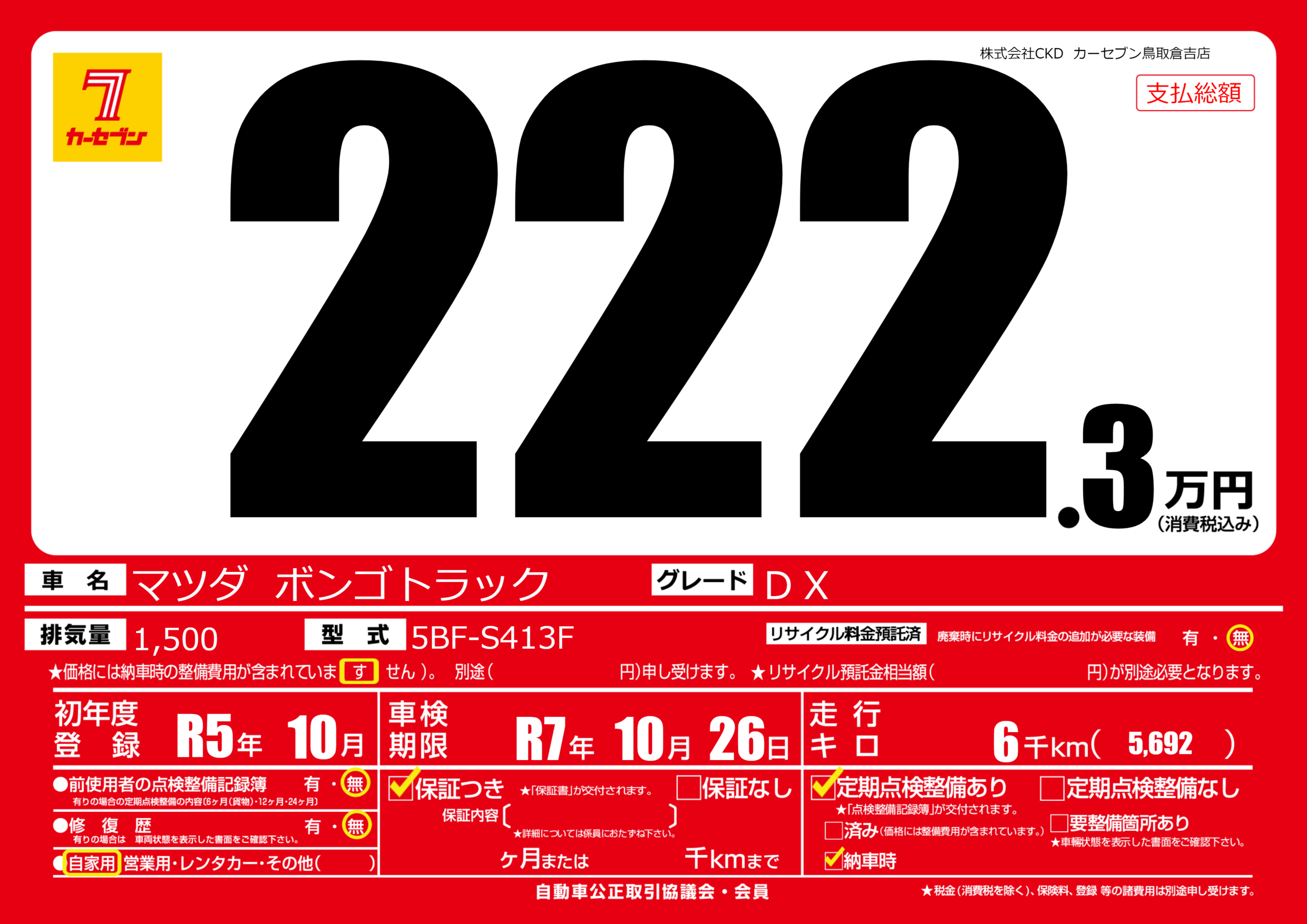 | 走行キロ | 0.6万km | 初年度登録 | R5年10月 |