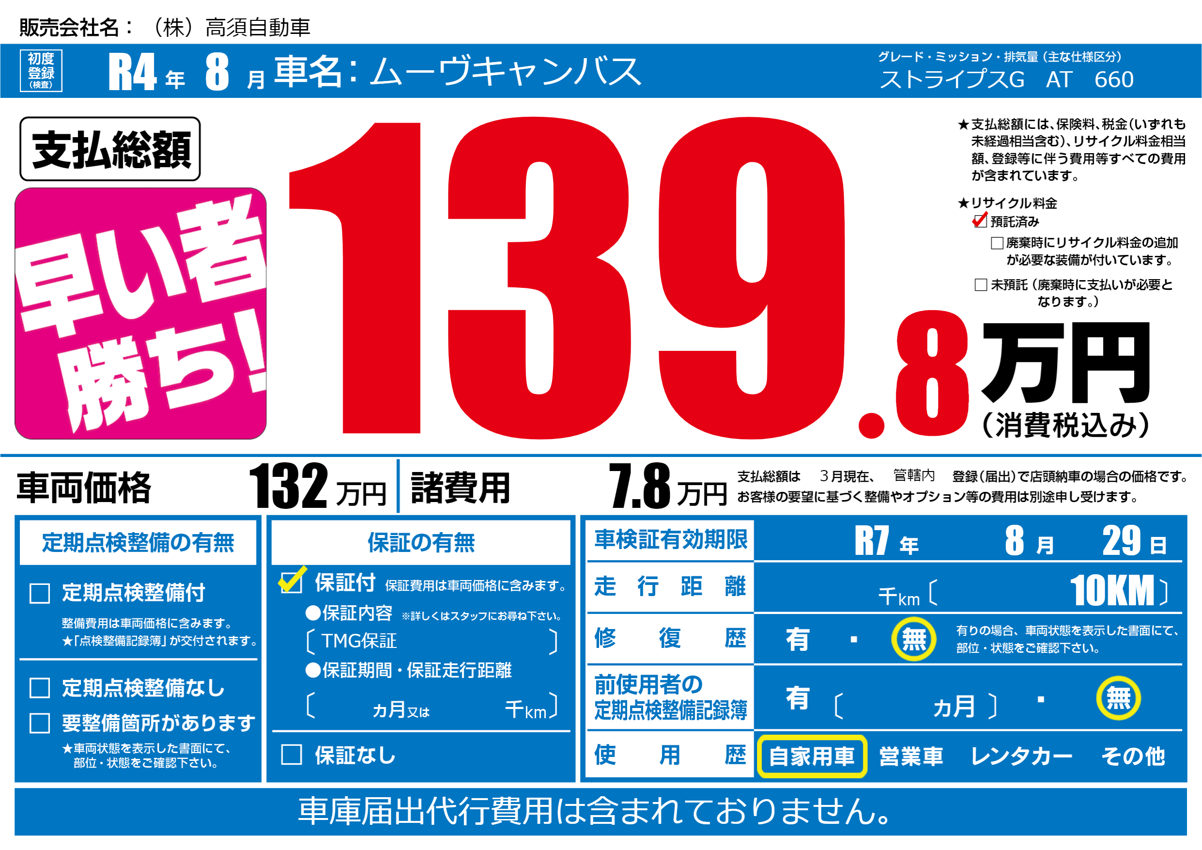 | 走行キロ | - | 初年度登録 | R4年8月 |