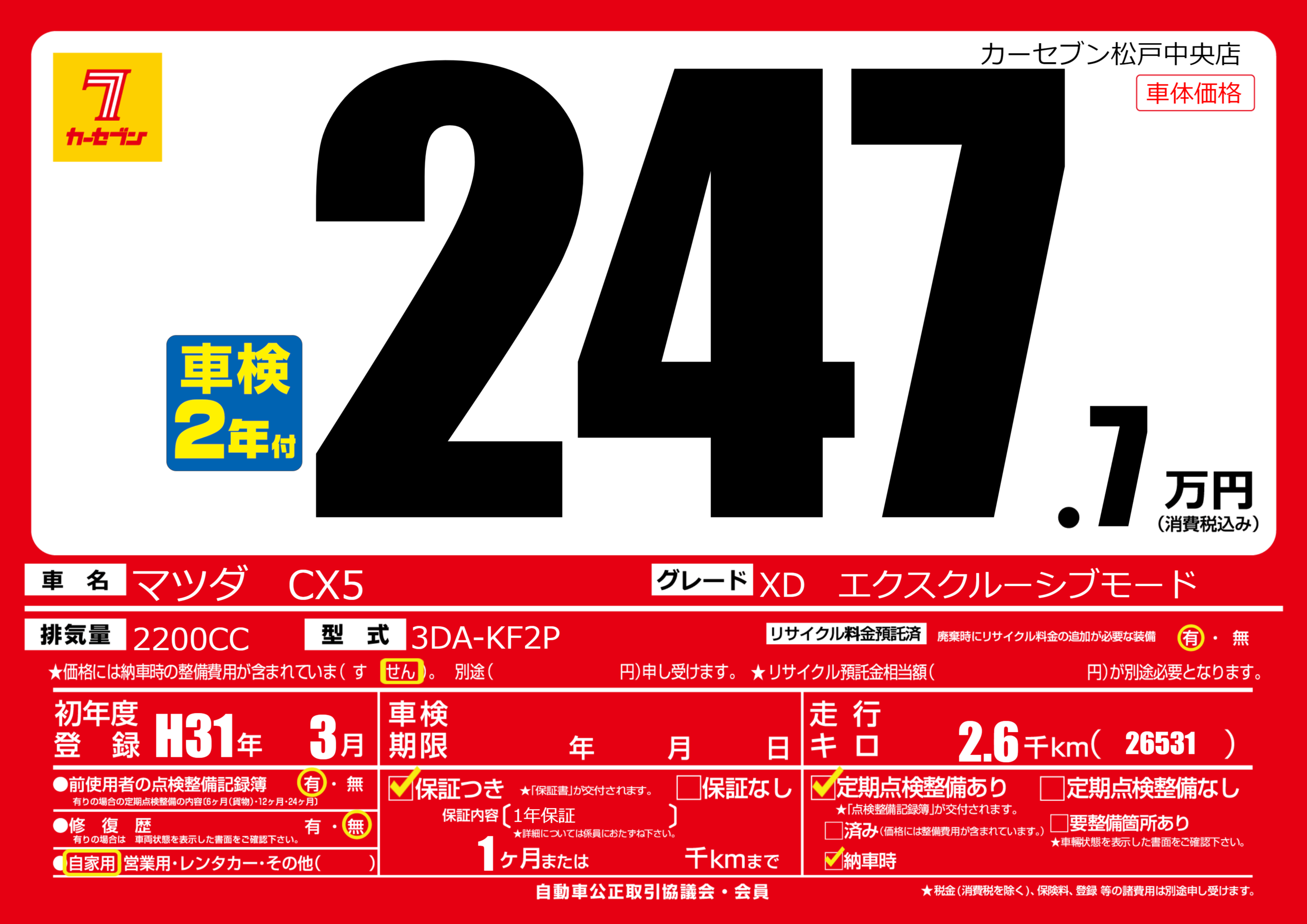 | 車名 | マツダ CX5 | グレード ミッション 排気量 |