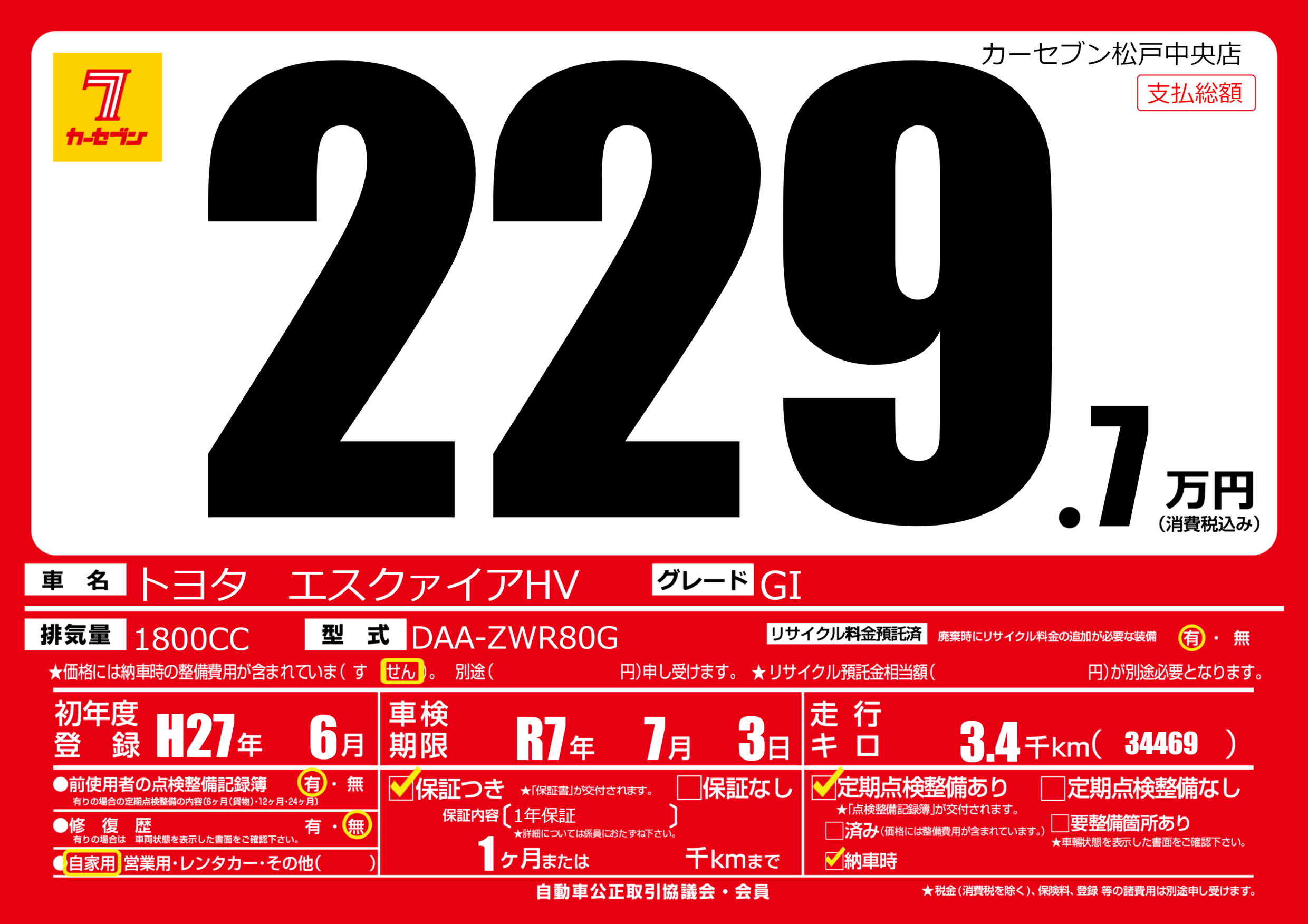 | 車名 | トヨタ エスクァイアHV | グレード ミッション 排気量 |
