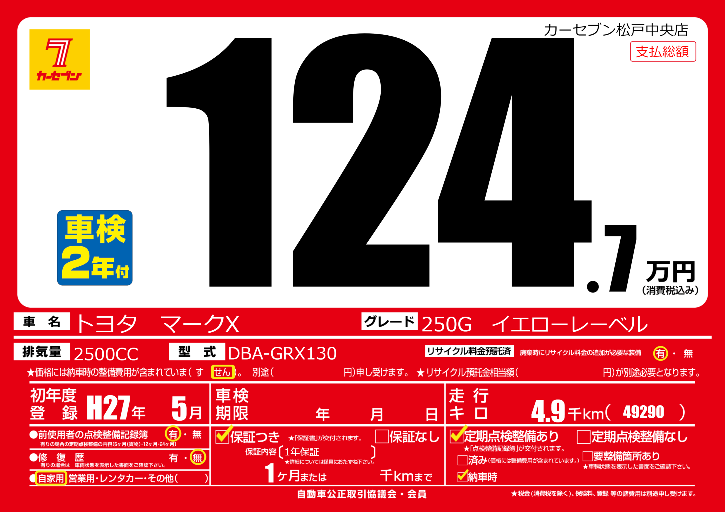 | 車名 | トヨタ マークX | グレード ミッション 排気量 |
