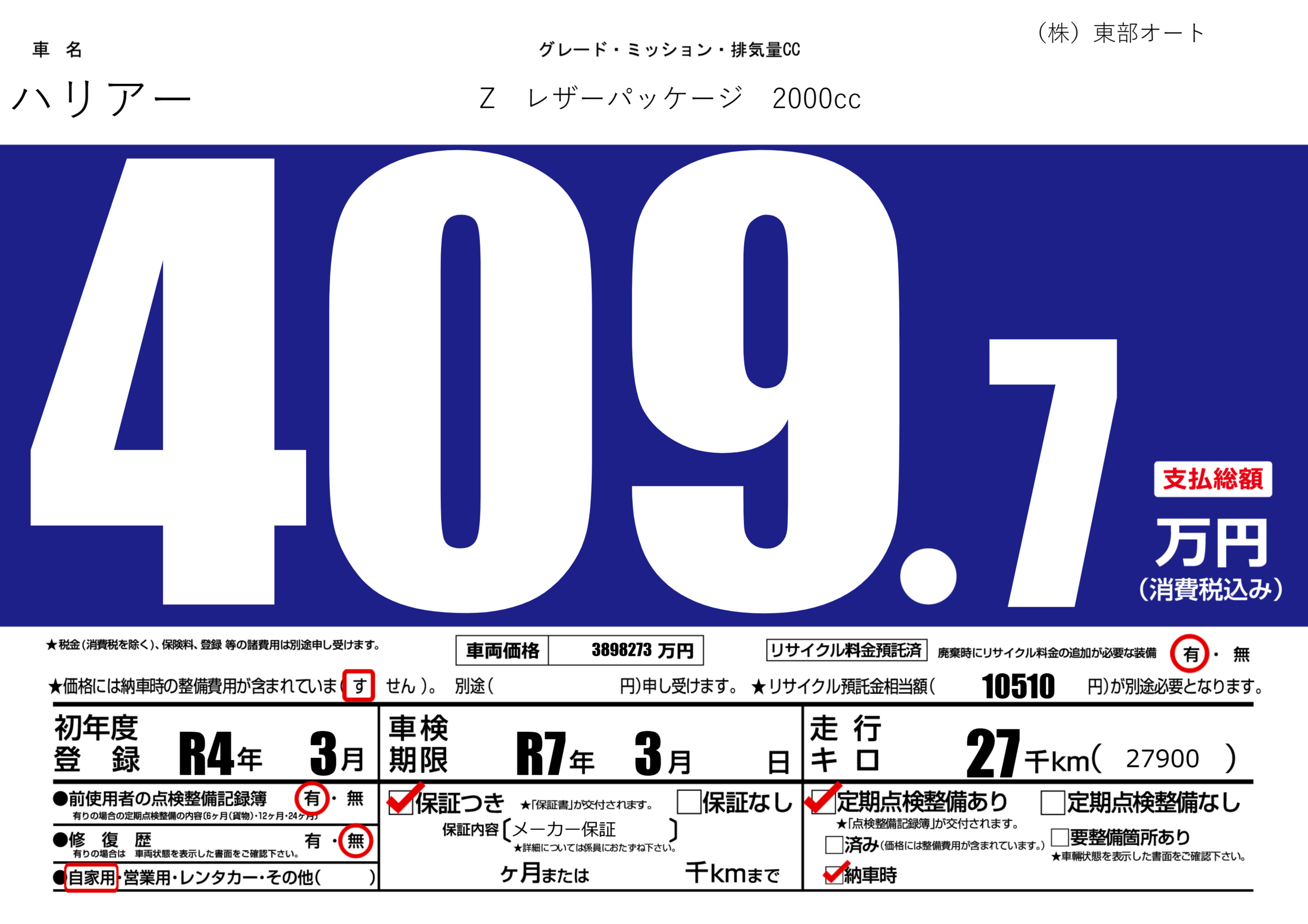 | 車名 | ハリアー | グレード ミッション 排気量 |