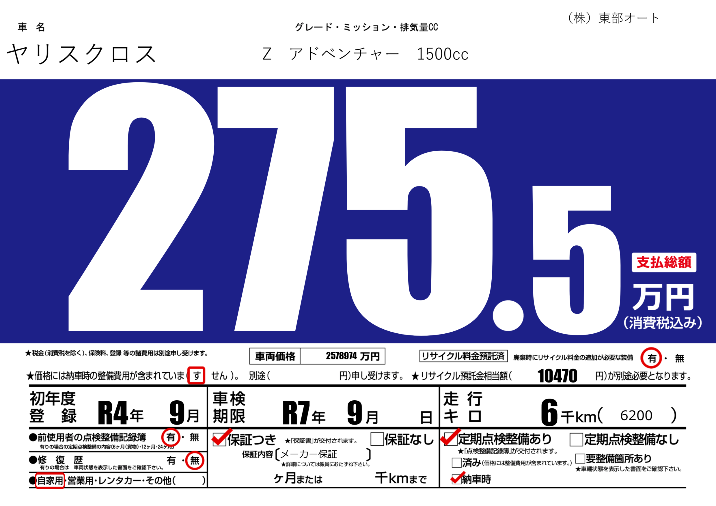 あり | リサイクル預託金相当額 | ( 10470円)が別途必要 |