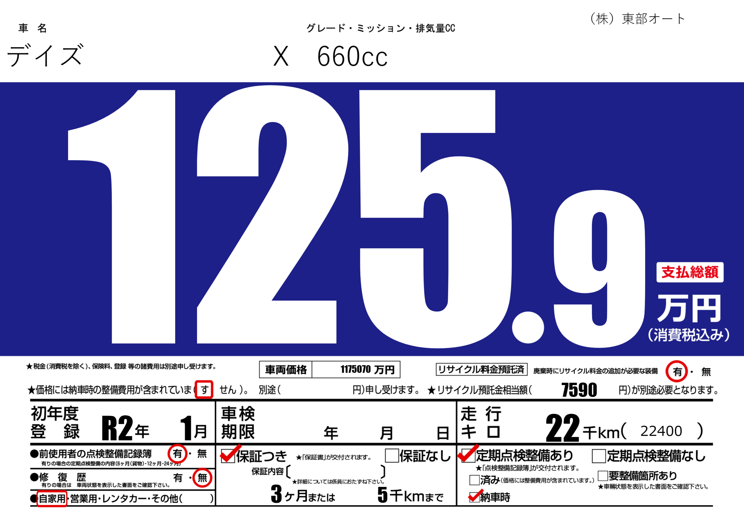 | 車名 | デイズ | グレード ミッション 排気量 |