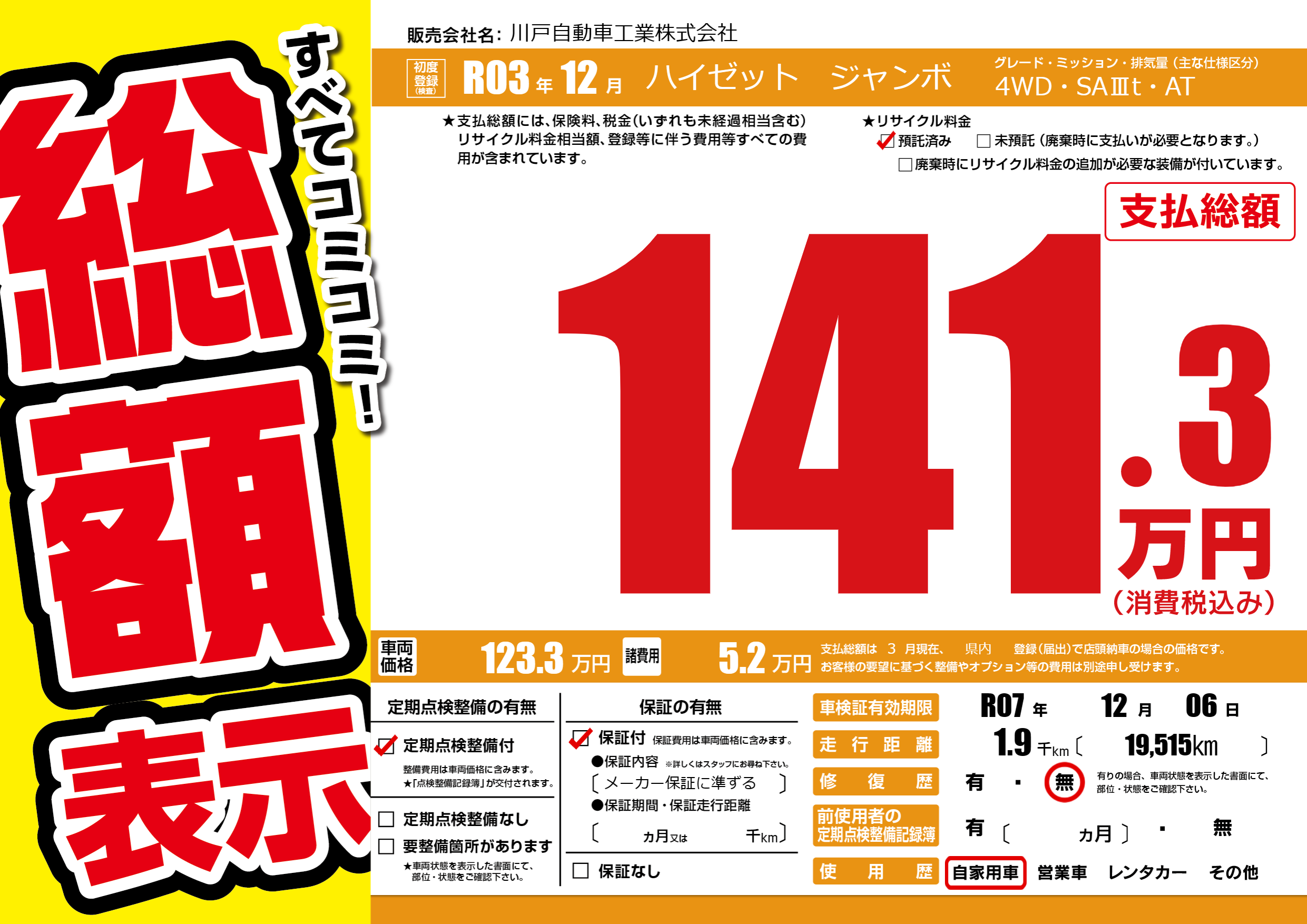| 車名 | ハイゼット ジャンボ | グレード ミッション 排気量 |