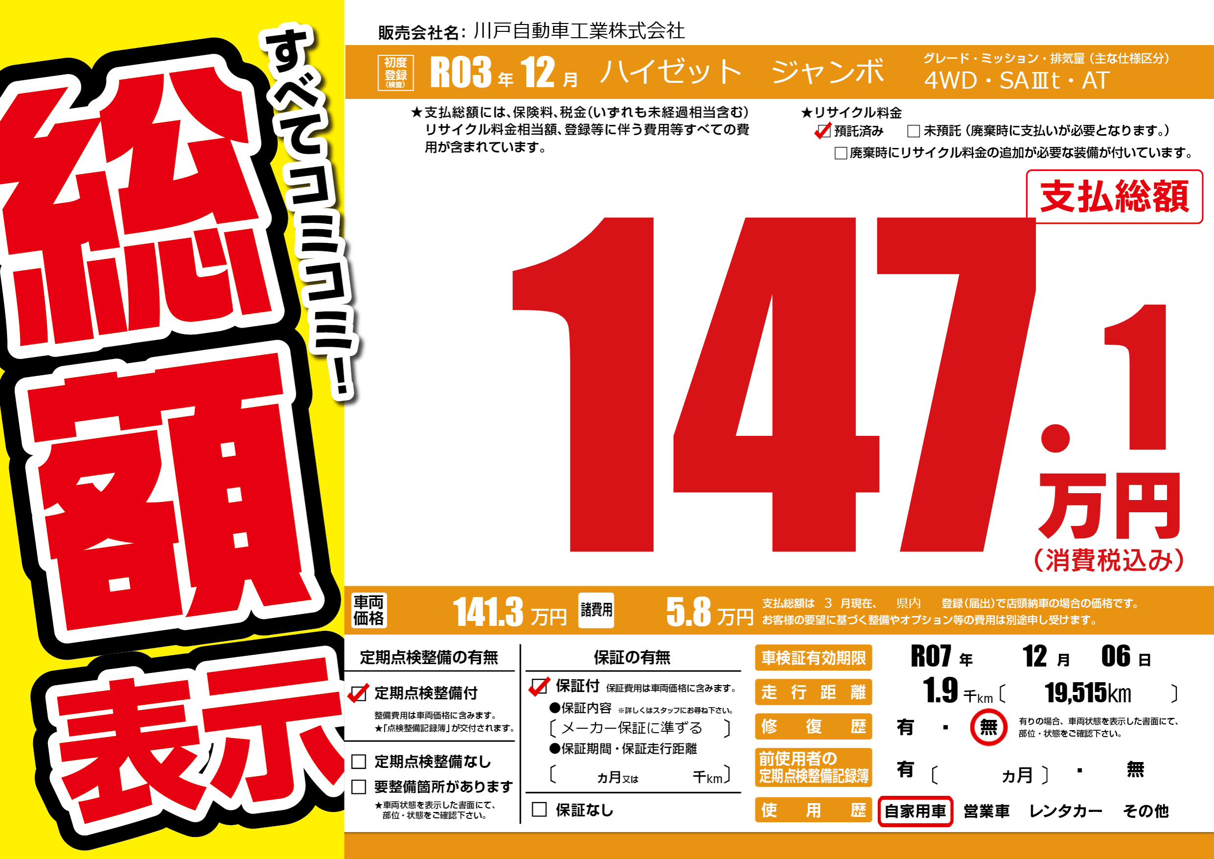 保証付き 保証内容(メーカー保証に準ずる) ヶ月または千km |