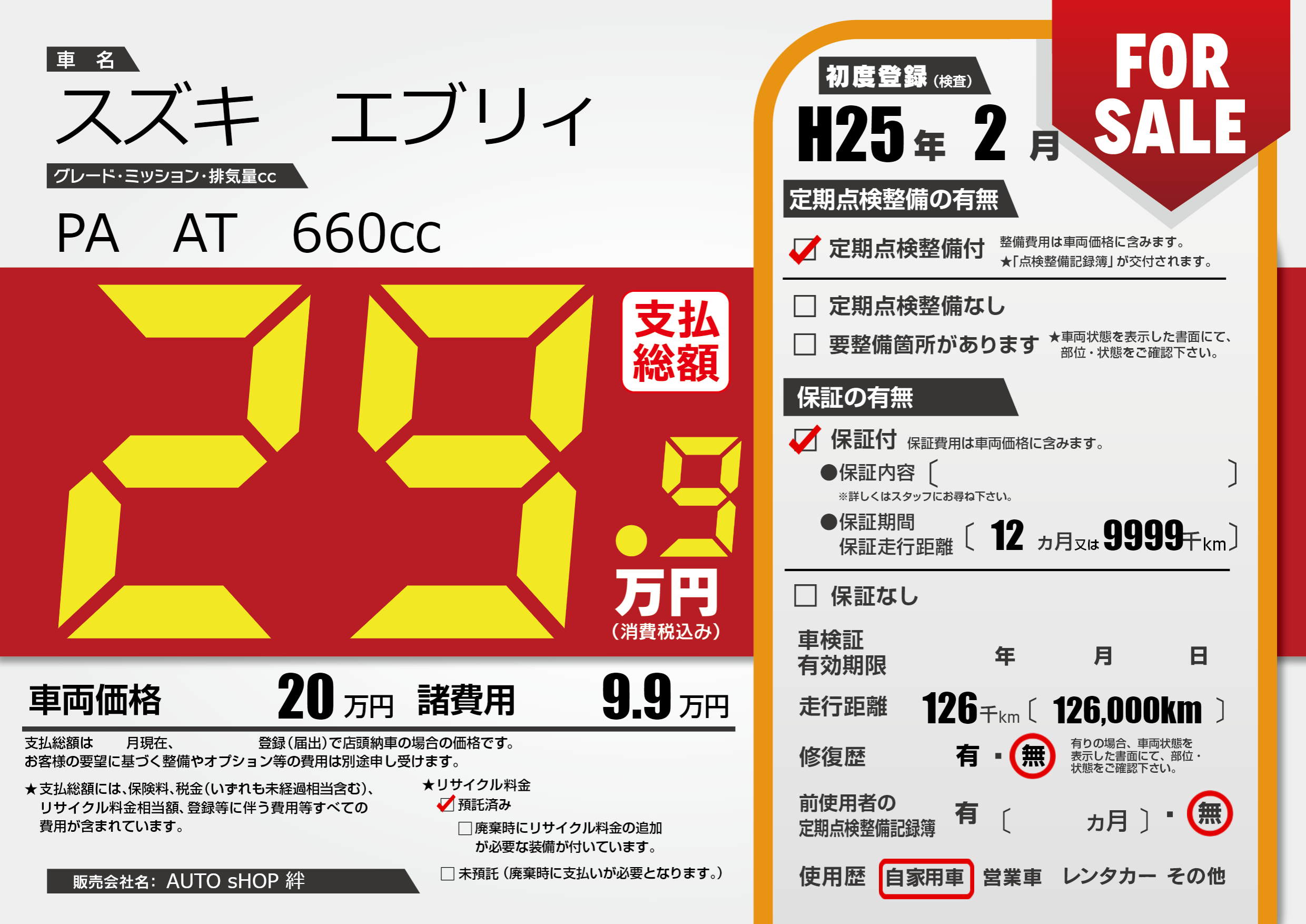 | 車名 | スズキ エブリィ | グレード ミッション 排気量 |