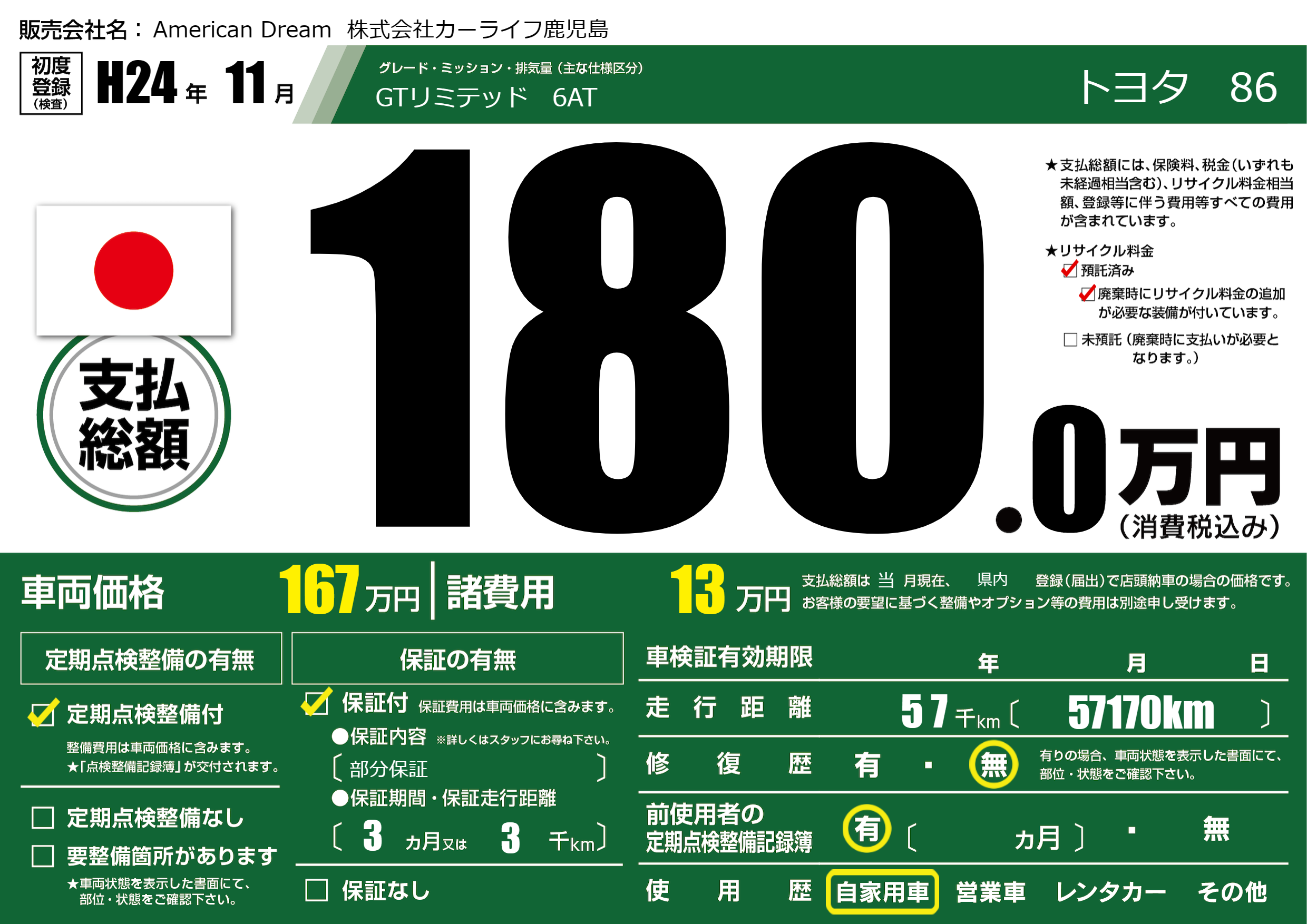 | 車名 | トヨタ 86 | グレード ミッション 排気量 |