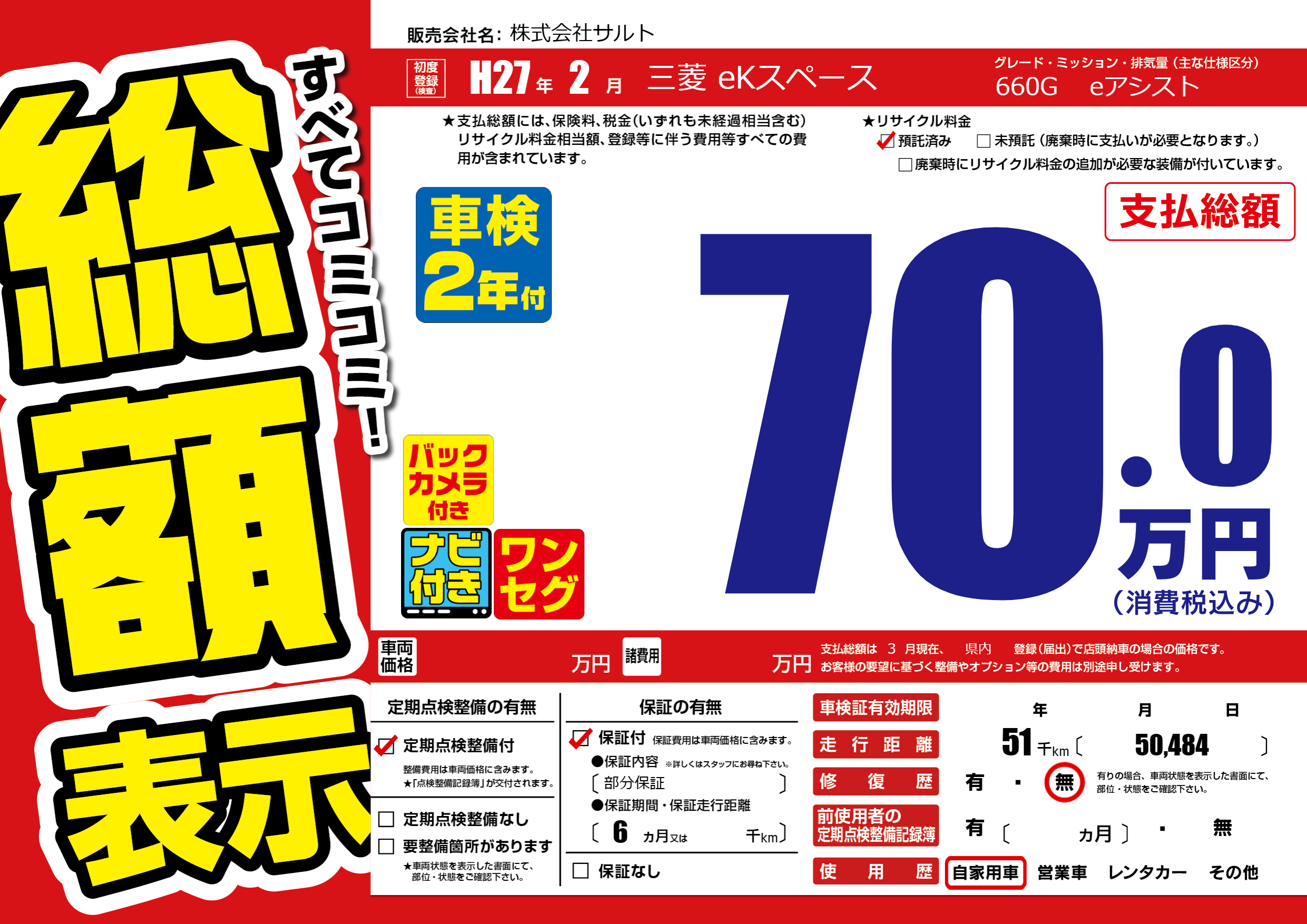| 走行キロ | 5.1万km | 初年度登録 | H27年2月 |
