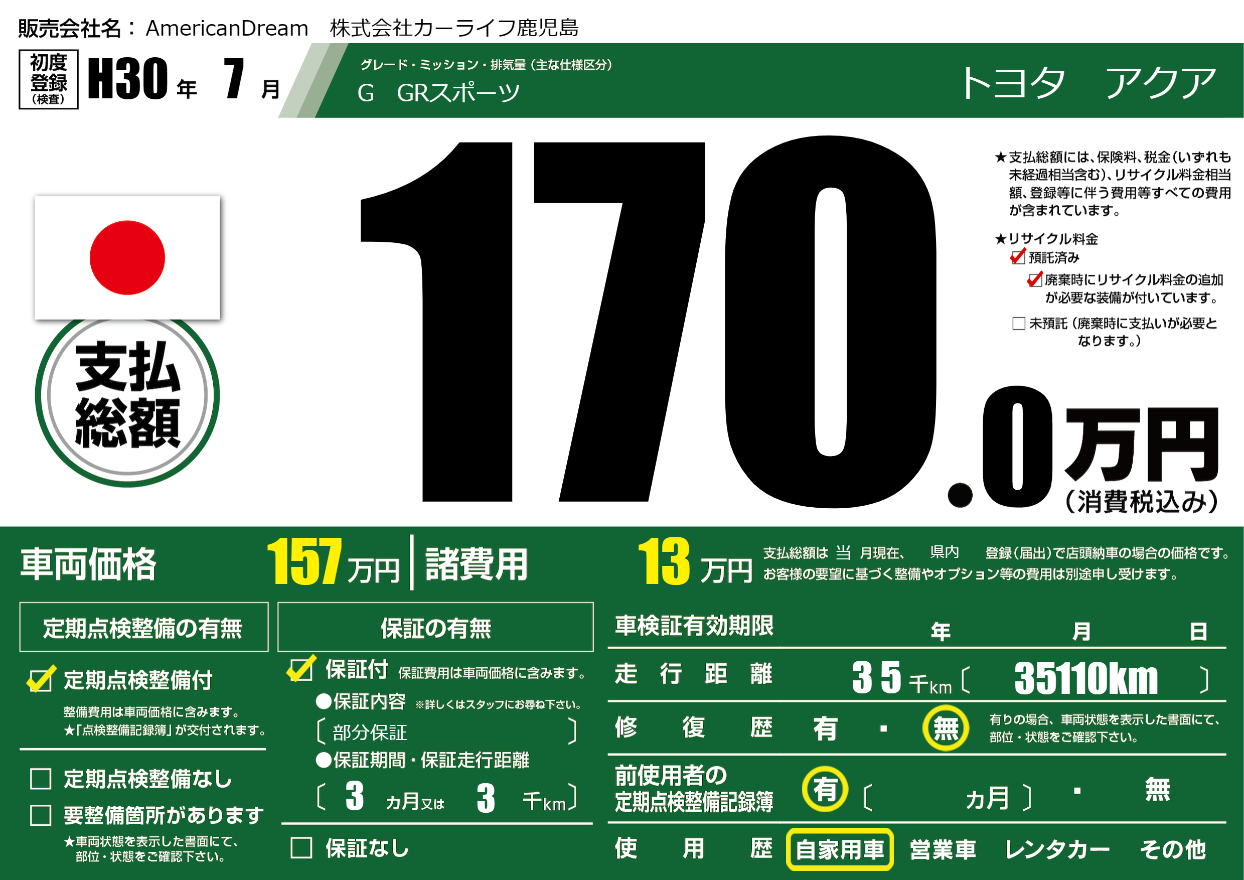 | 車名 | トヨタ アクア | グレード ミッション 排気量 |