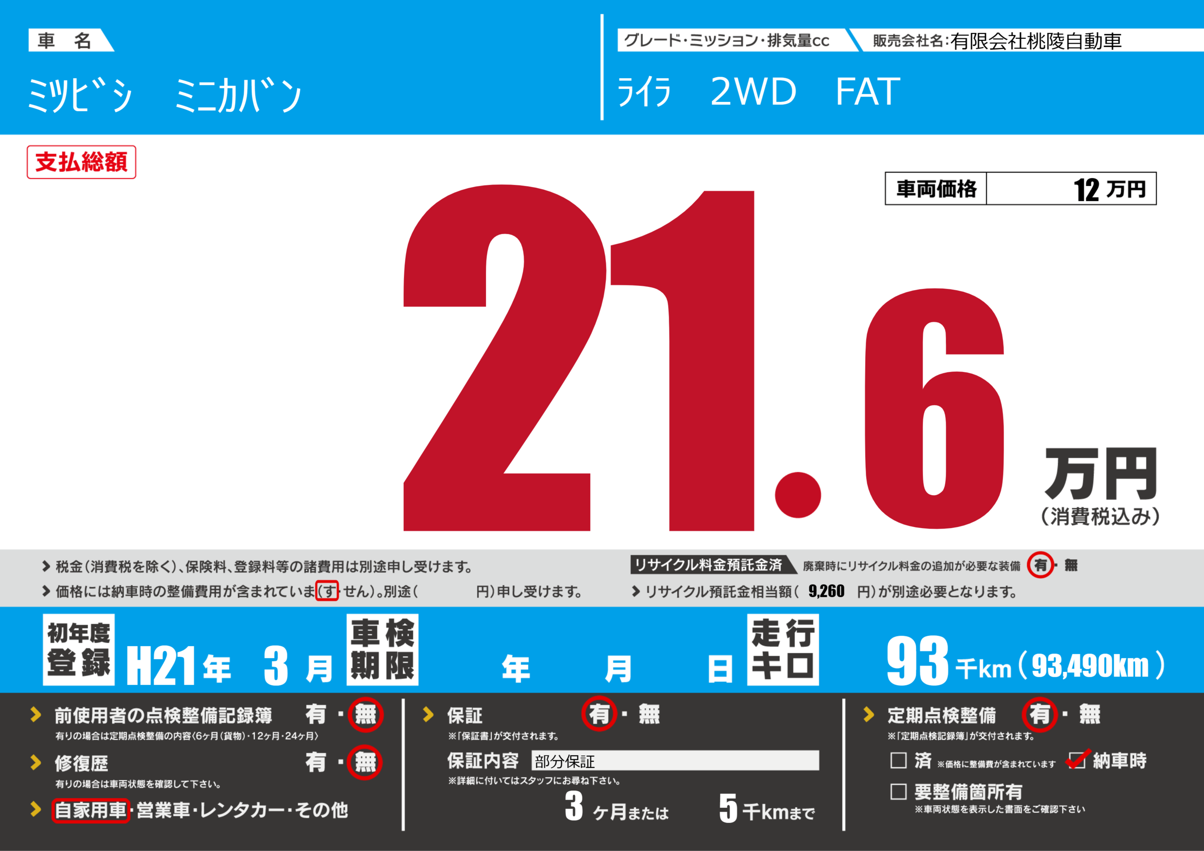 保証付き 保証内容(部分保証) 3ヶ月または(5)千kmまで |