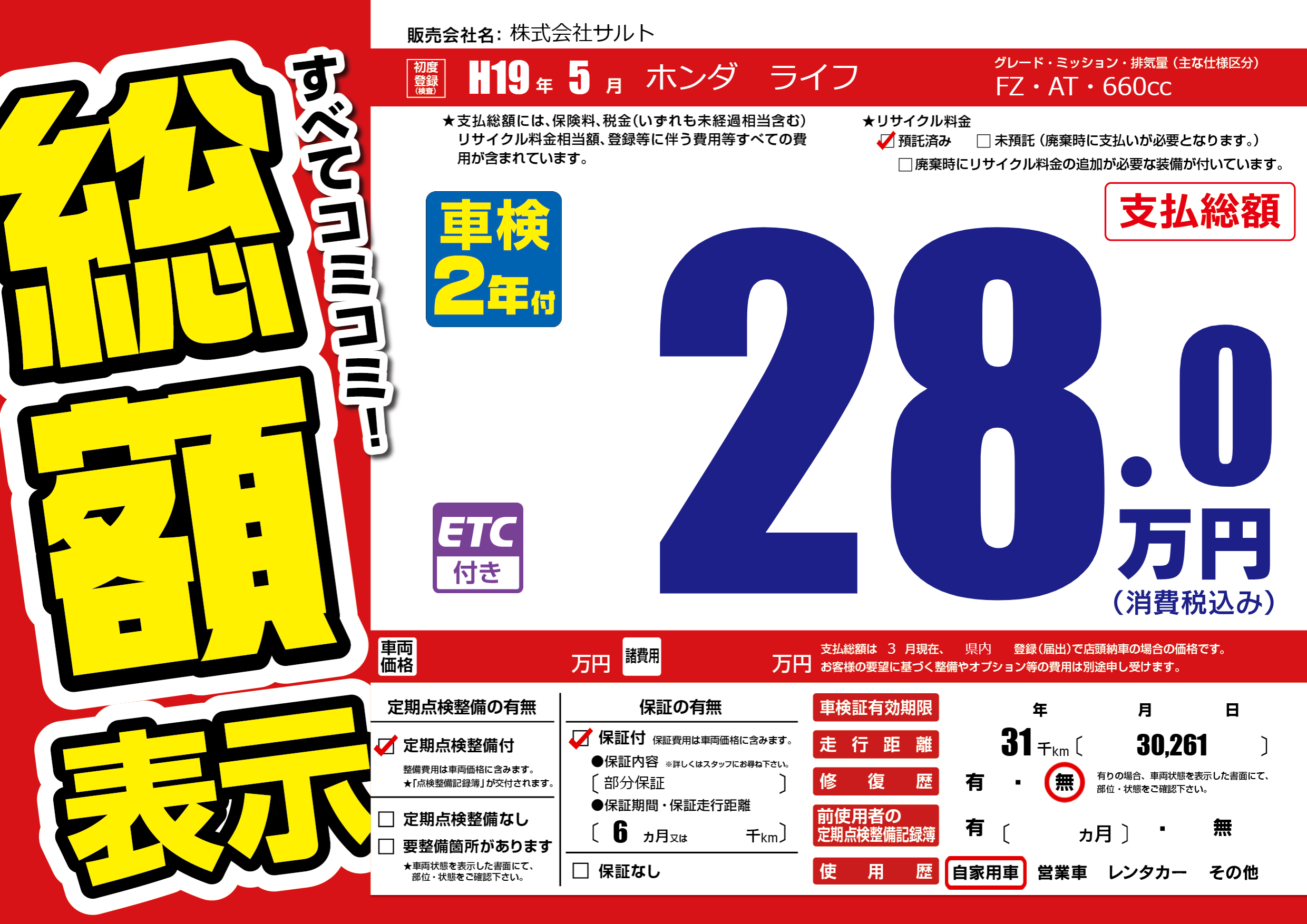 | 車名 | ホンダ ライフ | グレード ミッション 排気量 |