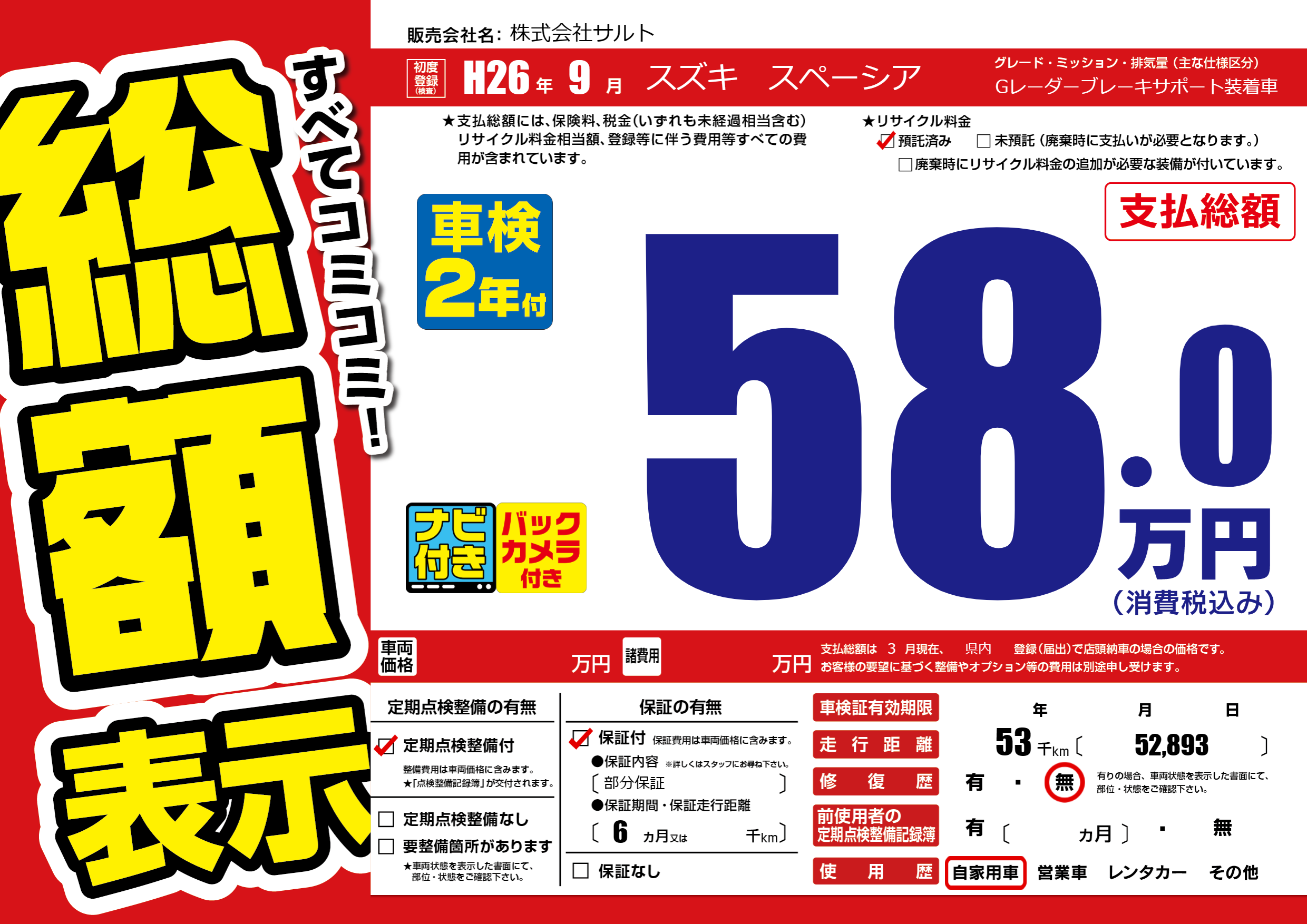 | 走行キロ | 5.3万km | 初年度登録 | H26年9月 |