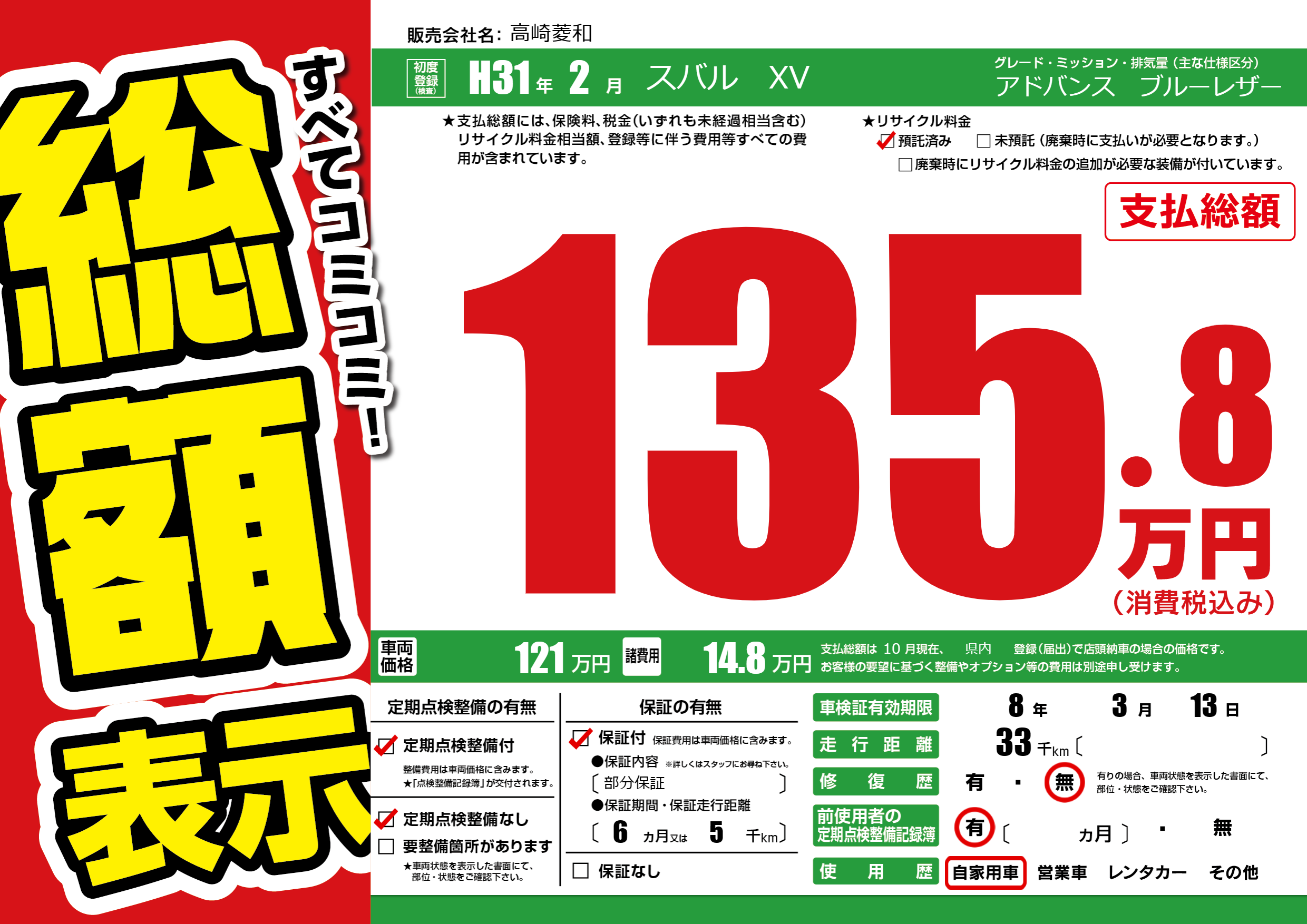 | 定期点検整備 | 定期点検整備あり 定期点検整備なし | ||