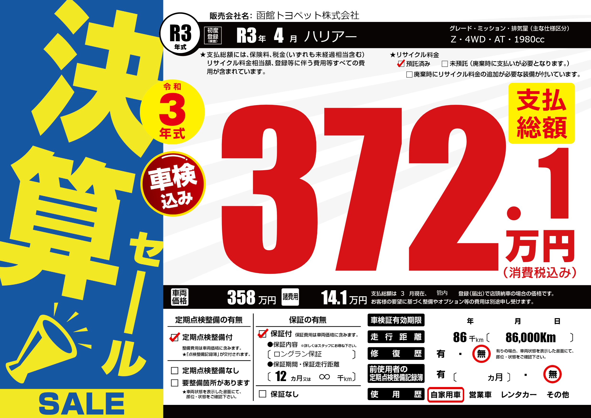| 走行キロ | 8.6万km | 初年度登録 | R3年4月 |