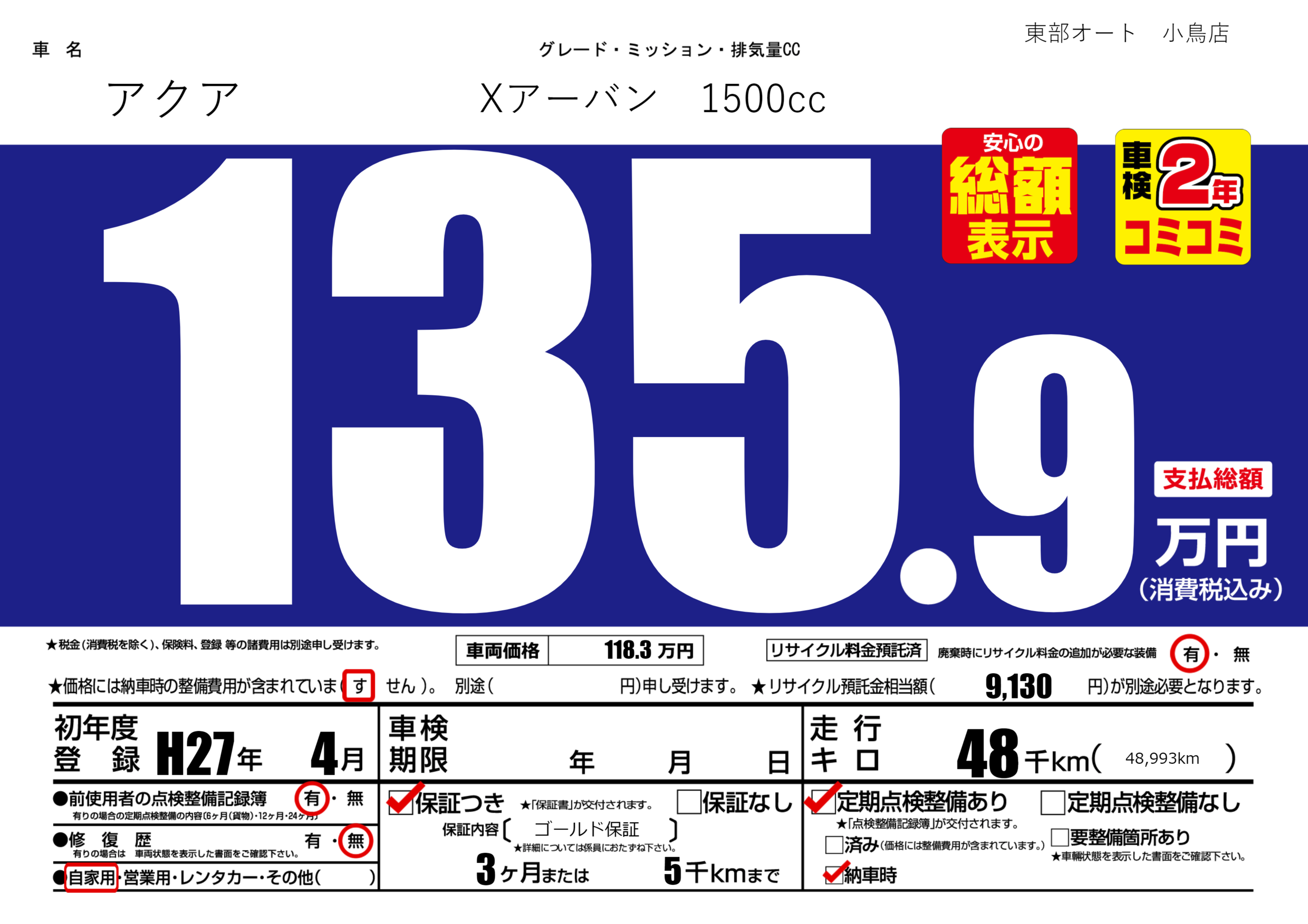 保証付き 保証内容( ゴールド保証) 3ヶ月または(5)千kmまで |