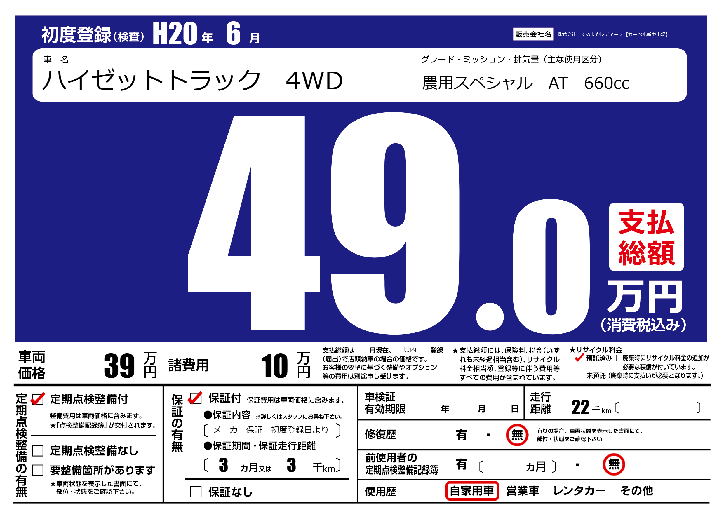 | 走行キロ | 2.2万km | 初年度登録 | H20年6月 |