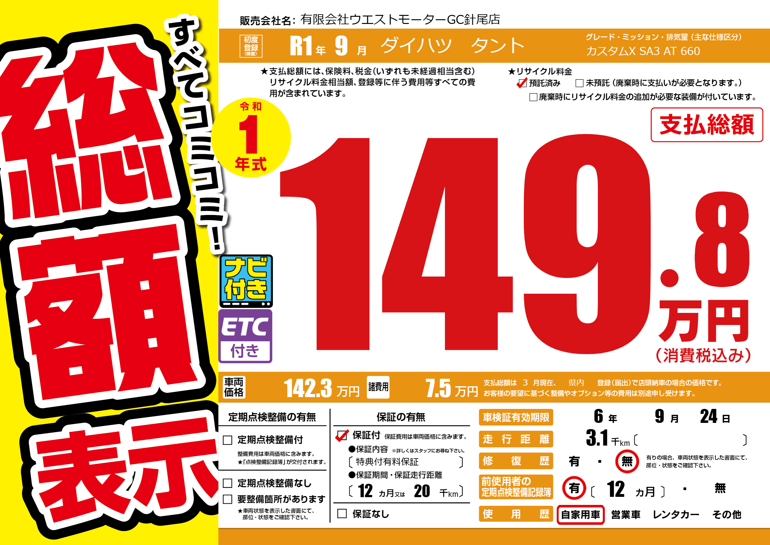 | 走行キロ | 0.3万km | 初年度登録 | R1年9月 |