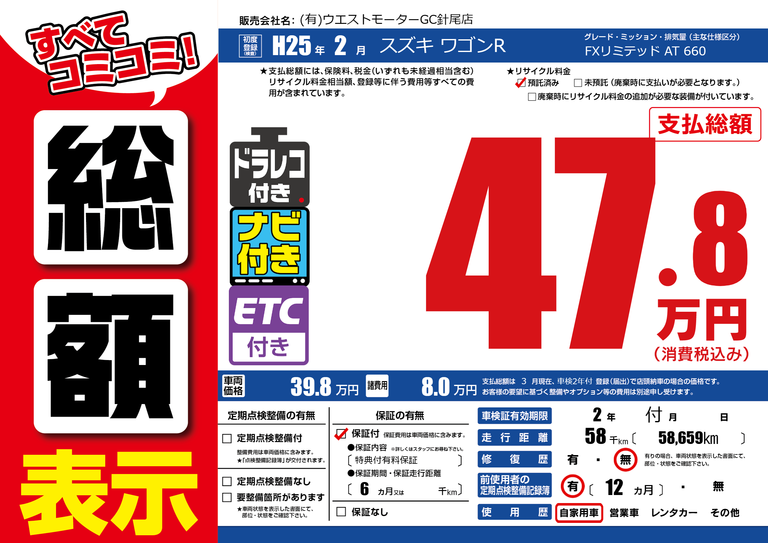 | 車名 | スズキ ワゴンR | グレード ミッション 排気量 |