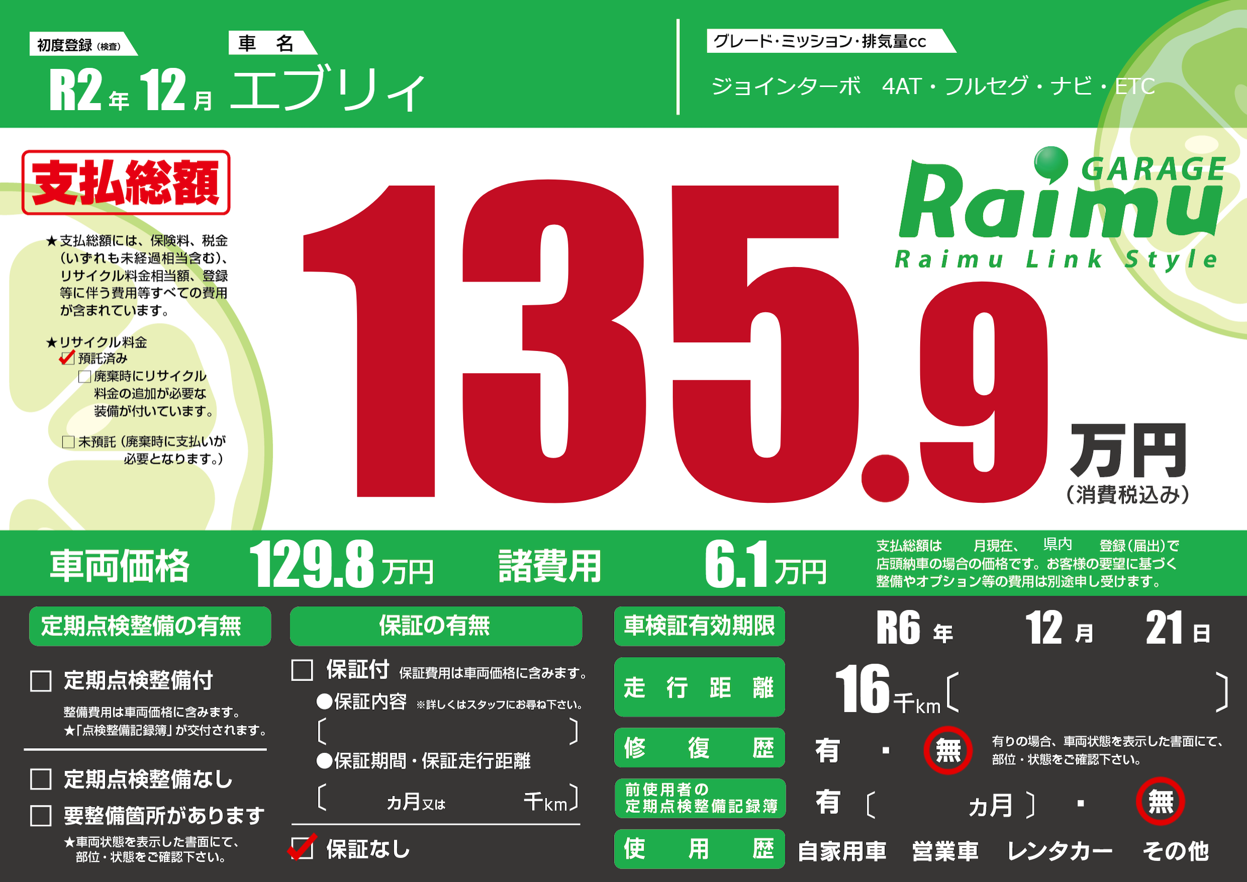 | 車名 | エブリィ | グレード ミッション 排気量 |