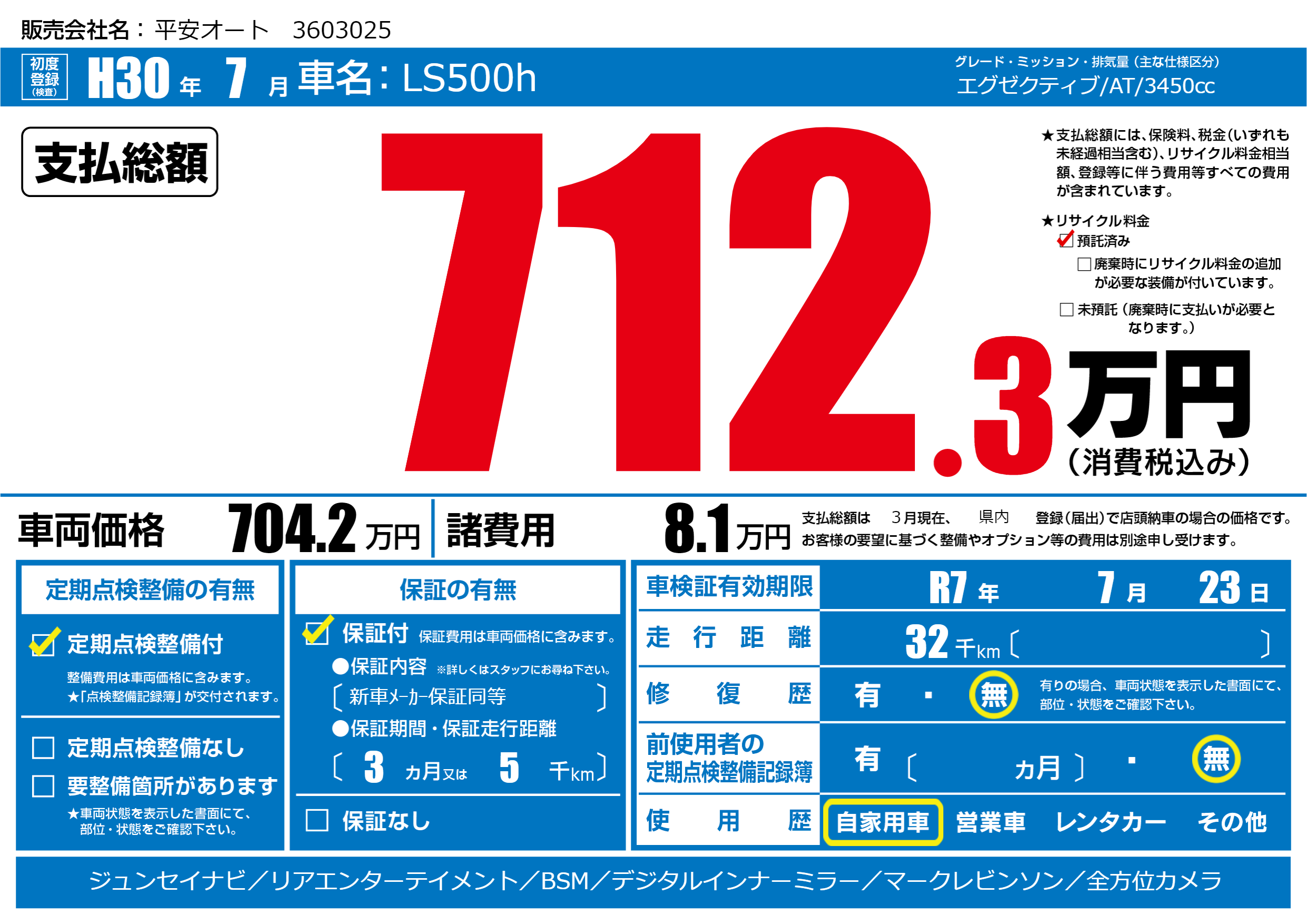 | 車検制限 | R7年 7月 23日 | ||