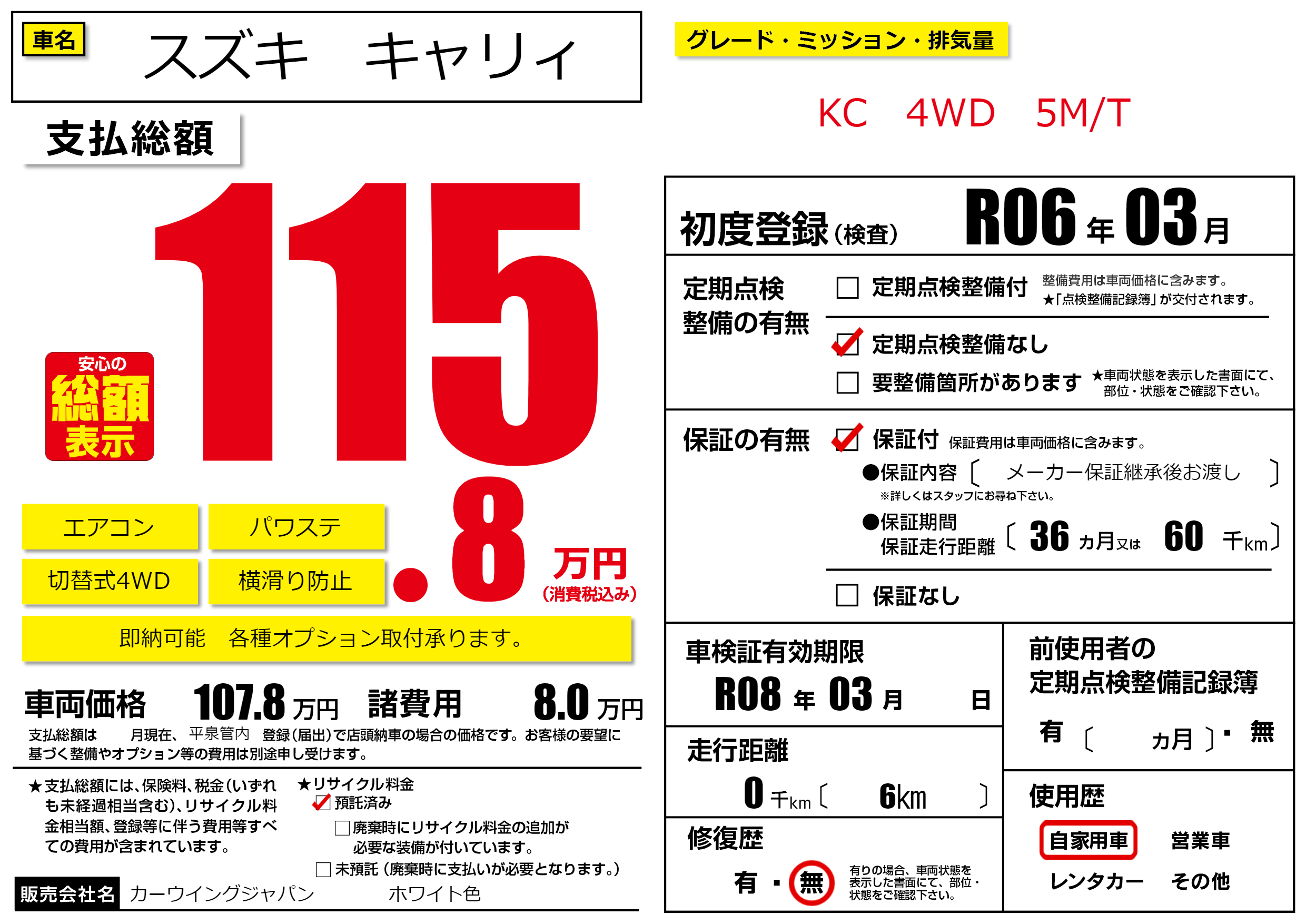 | 車名 | スズキ キャリィ | グレード ミッション 排気量 |