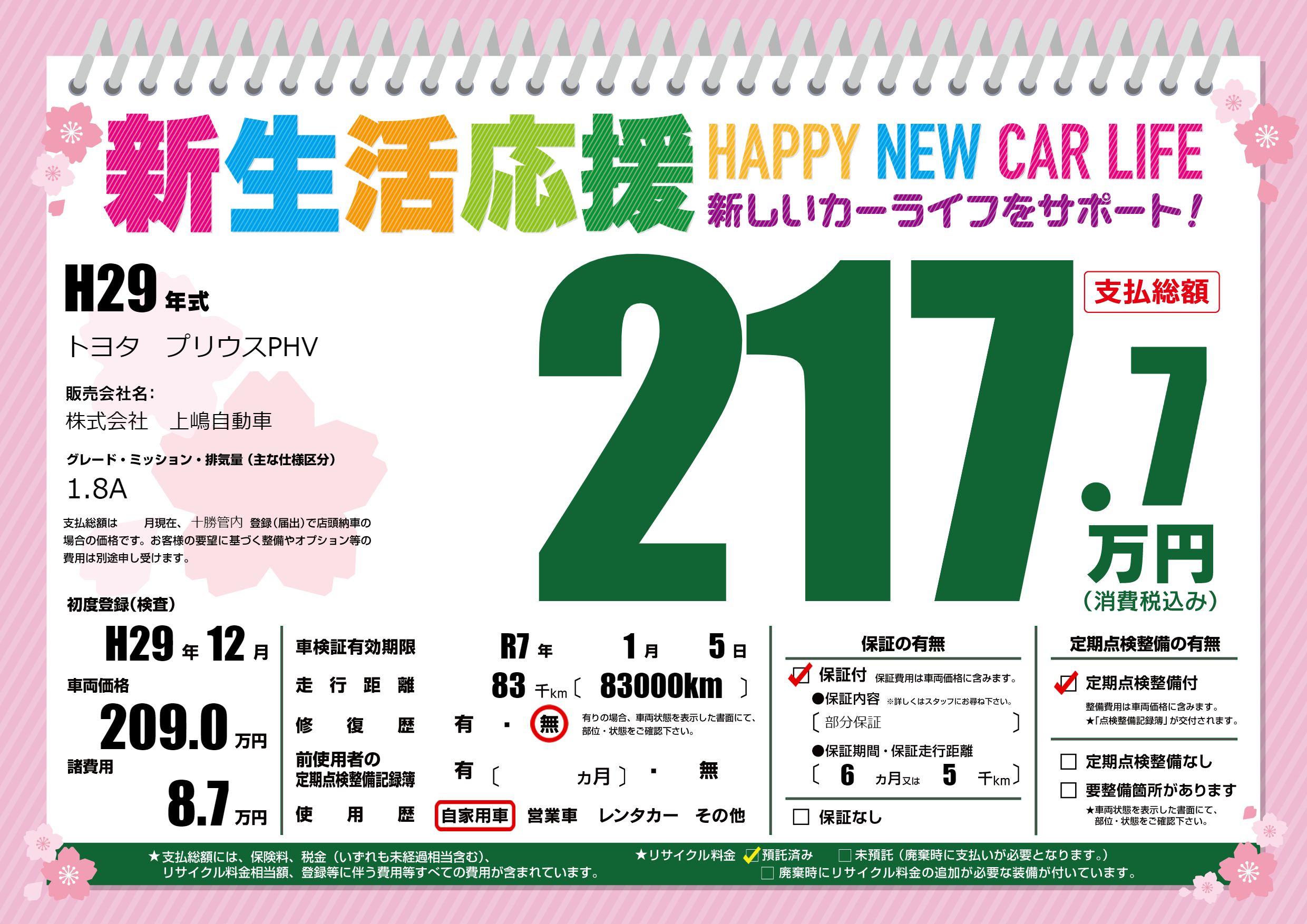 | 車名 | トヨタ プリウスPHV | グレード ミッション 排気量 |