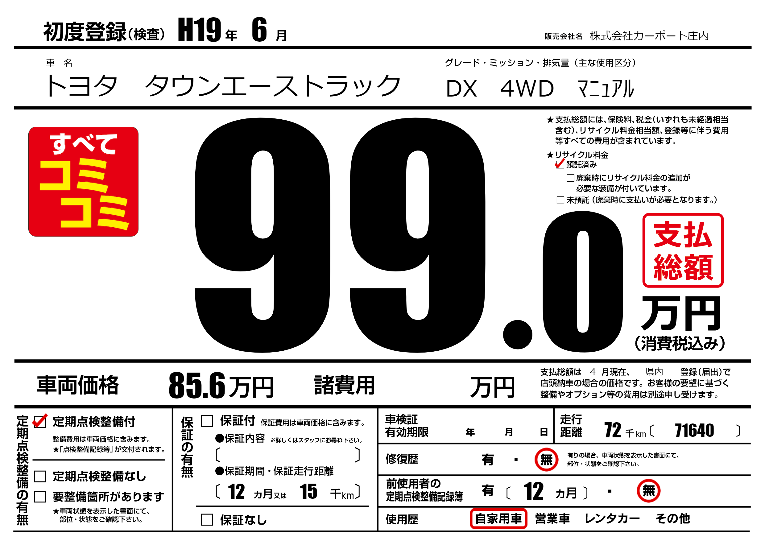 | 車名 | トヨタ タウンエーストラック | グレード ミッション 排気量 |