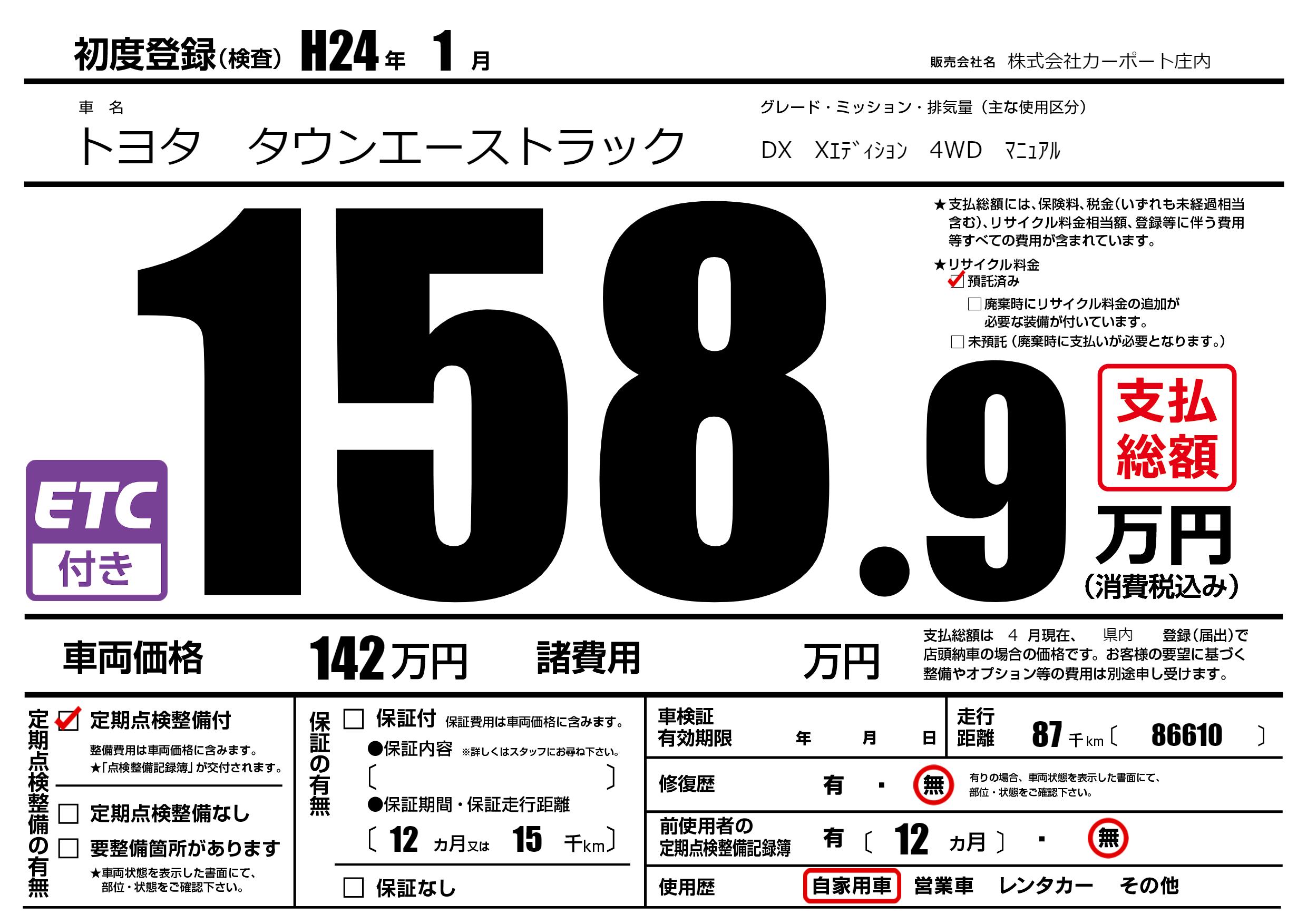 | 車名 | トヨタ タウンエーストラック | グレード ミッション 排気量 |