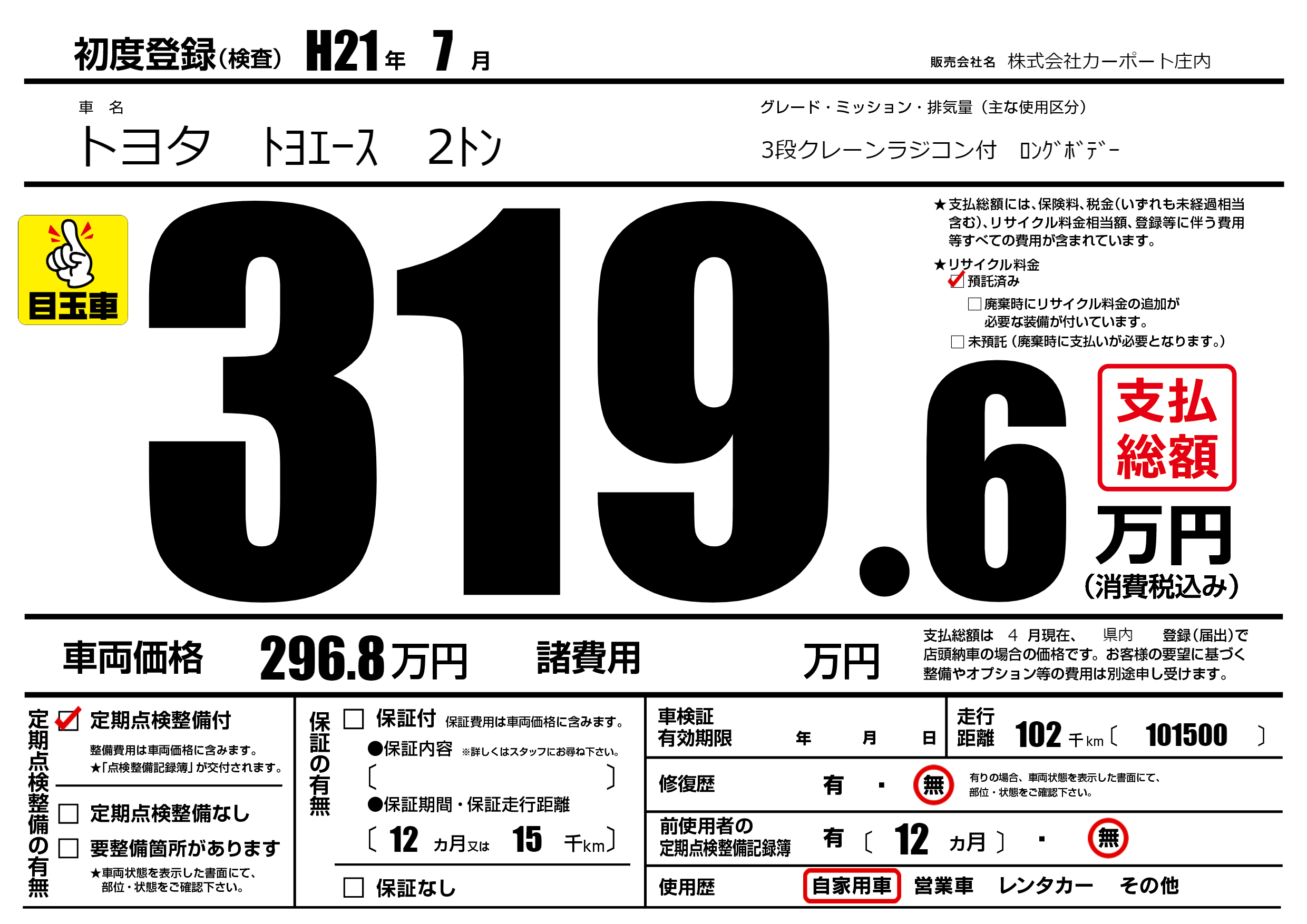 | 車名 | トヨタ トヨエース 2トン | グレード ミッション 排気量 |