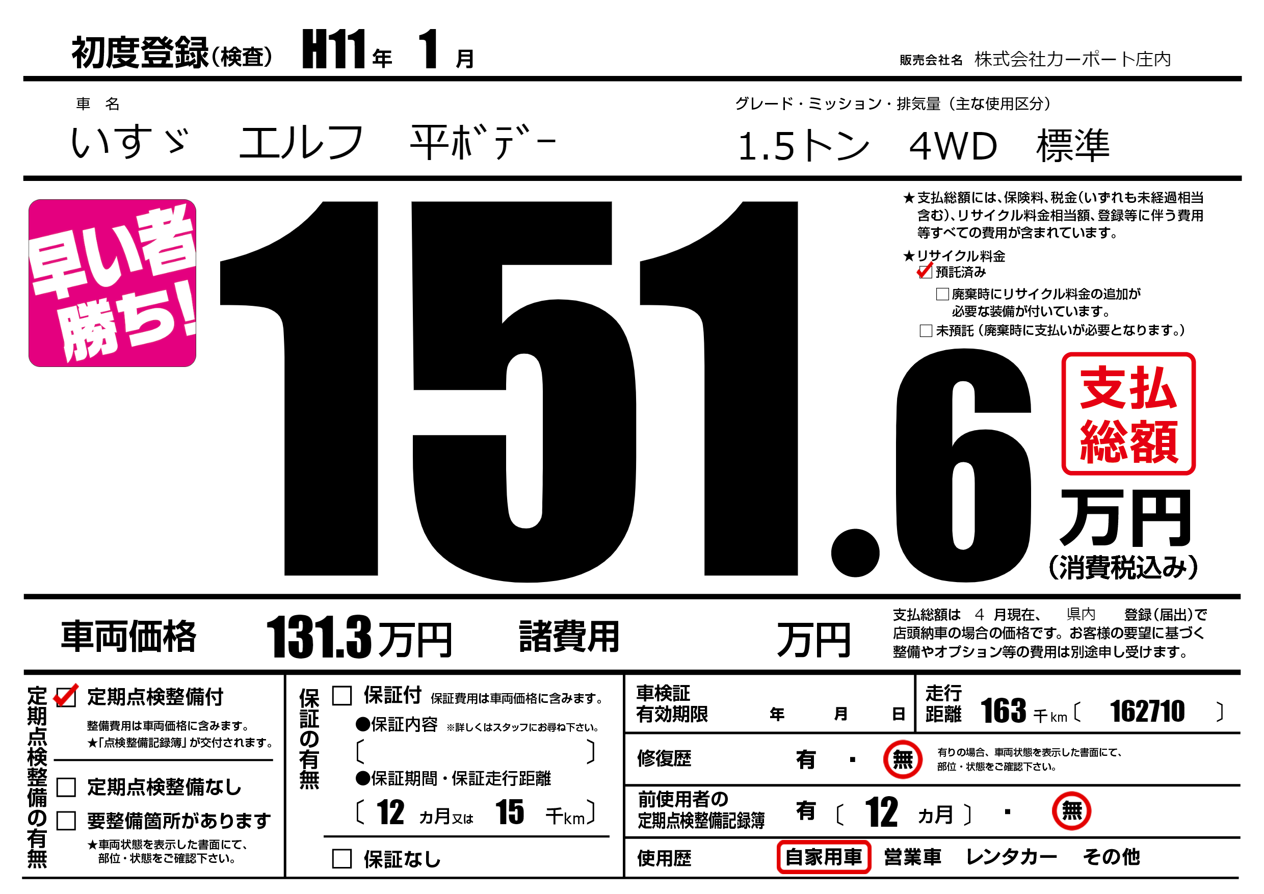 | 走行キロ | 16.3万km | 初年度登録 | H11年1月 |