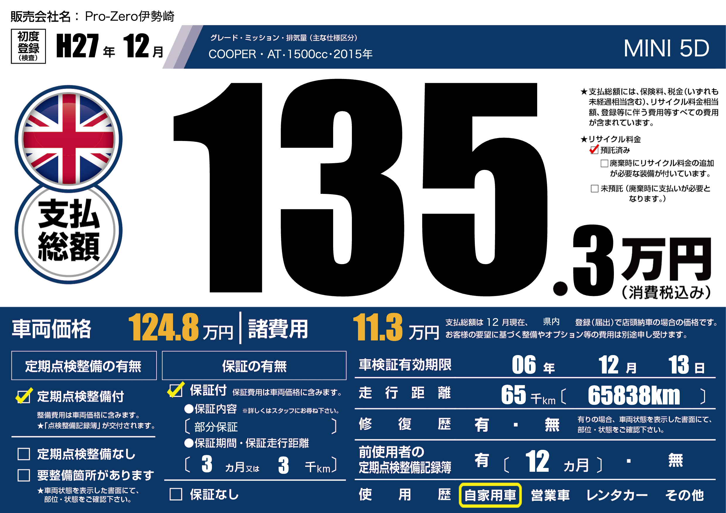 | 車名 | MINI 5D | グレード ミッション 排気量 |
