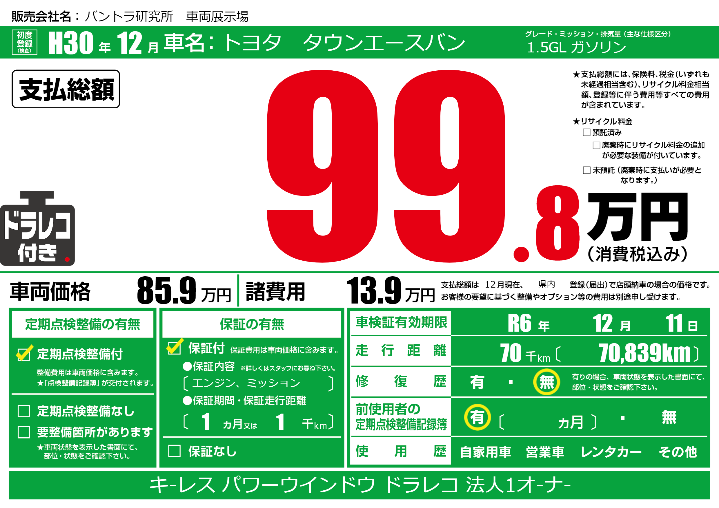 | 車名 | トヨタ タウンエースバン | グレード ミッション 排気量 |